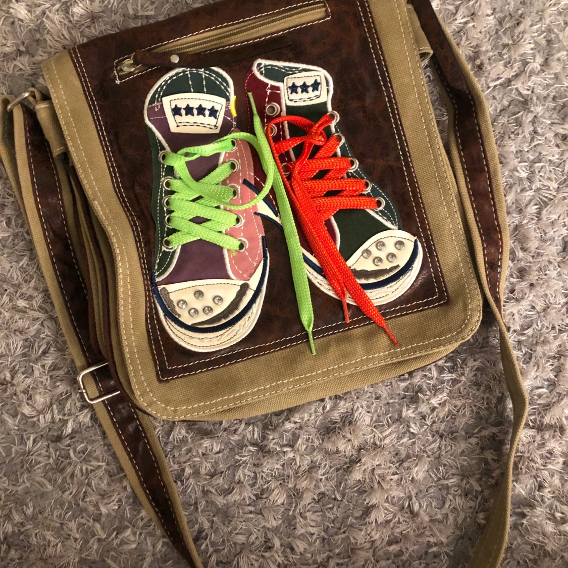 Jättefin väska med skodekorstion på framsidan, säljs pga kommer ej till använding. är i bra skick och har många bra fack