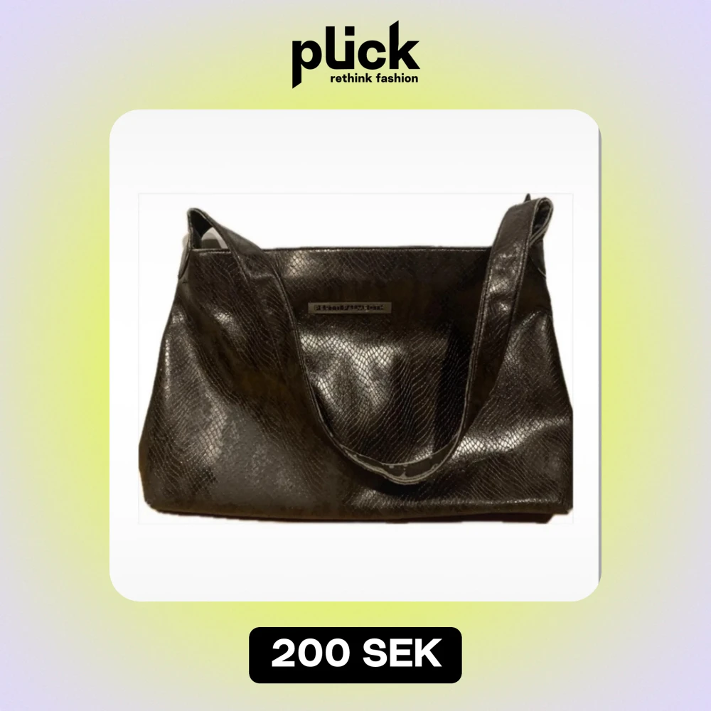 True vintage märkes Handväska med axelband från Pertti Palmrot Glansigt ”snake skinn” material, inte äkta läder, Smal och bred med innerfickor Materialet har skavts av på sidorna längre ner på väskan se bilder på defekter och handtaget är slitna
