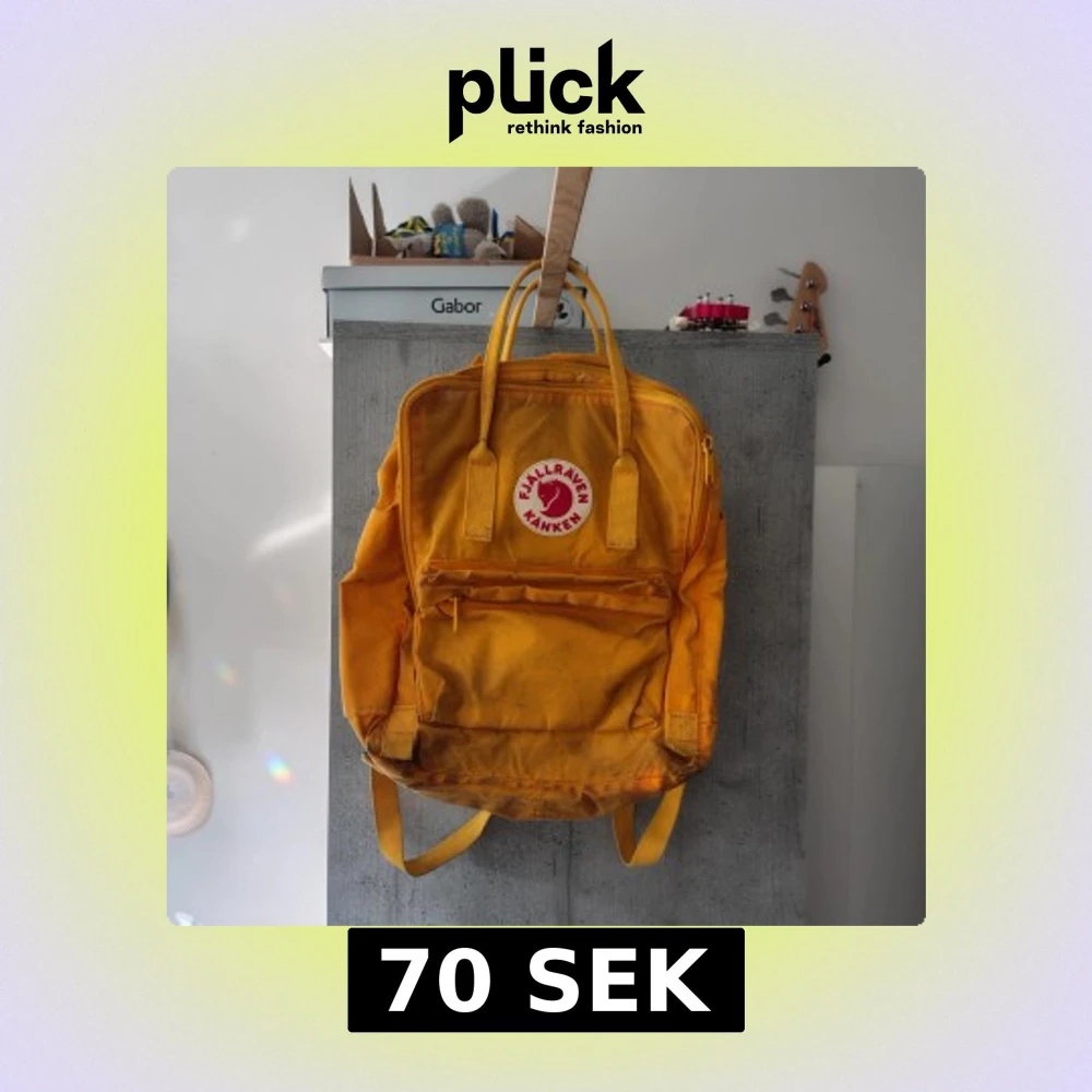 gul Fjällräven Kånken ryggsäck, lite smutsig, går säkert att tvätta bort om man vill. PM för frågor å fler bilder