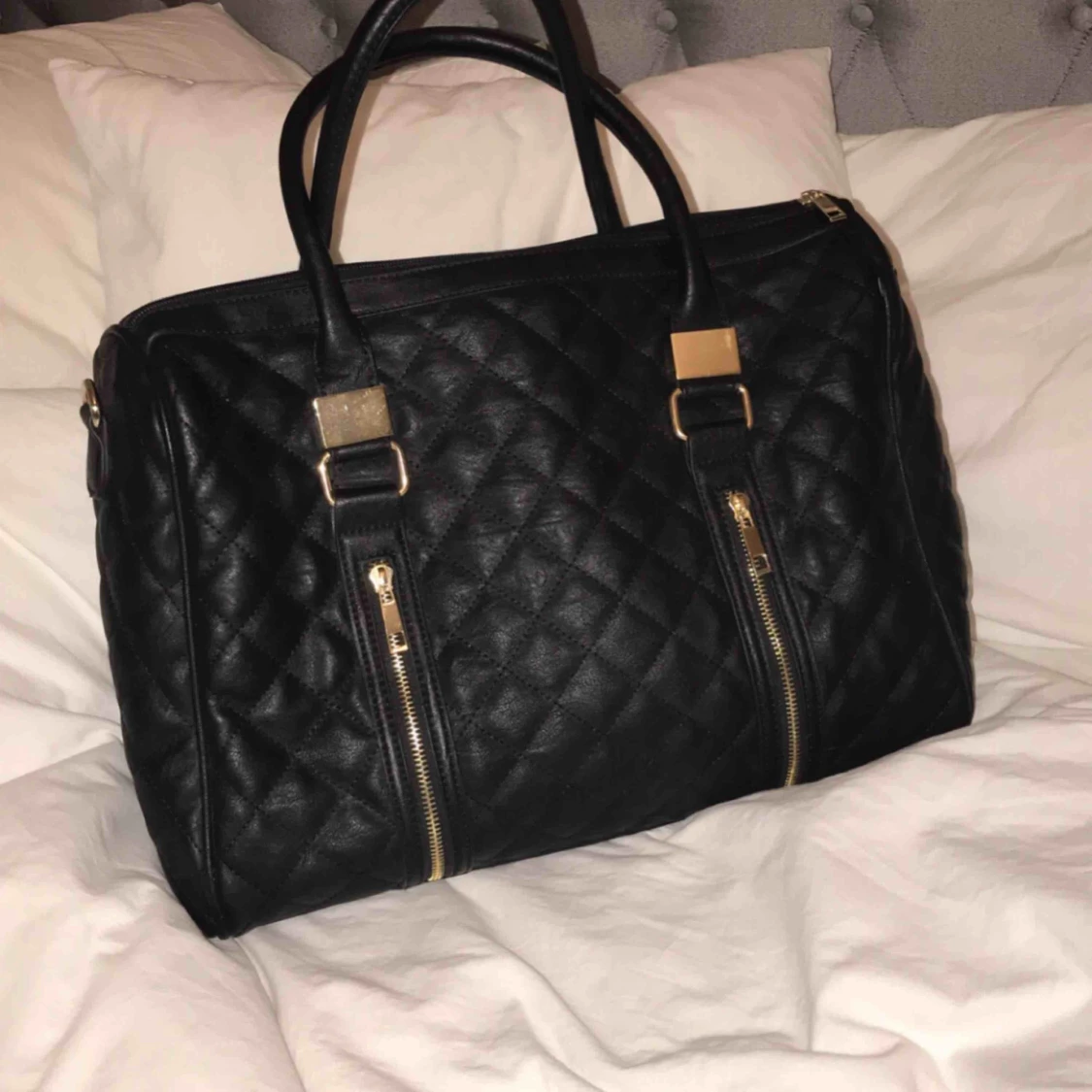 En stor och rymlig väska. I finns de 2 små öppna fack och ett med dragkedja.