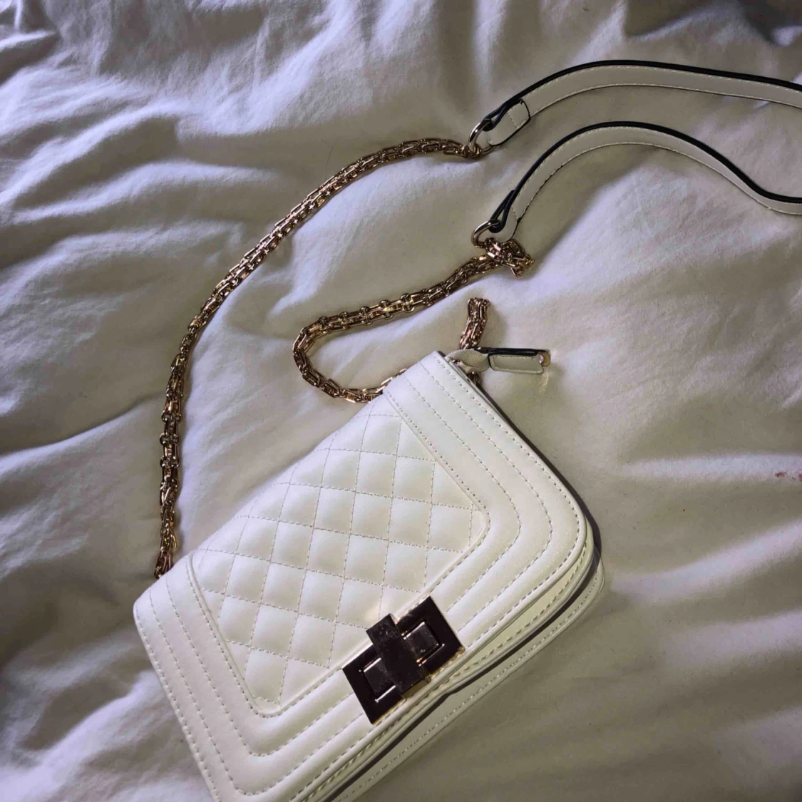 Vit väska, med gulddetaljer, använd 4-5 gånger, småmärken på låset annars är den bara i fint o rent skick.