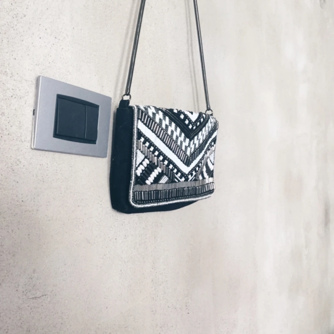 Väska med pärlor broderade på framsidan. Använd väldigt sparsamt och inga pärlor har ramlat av!