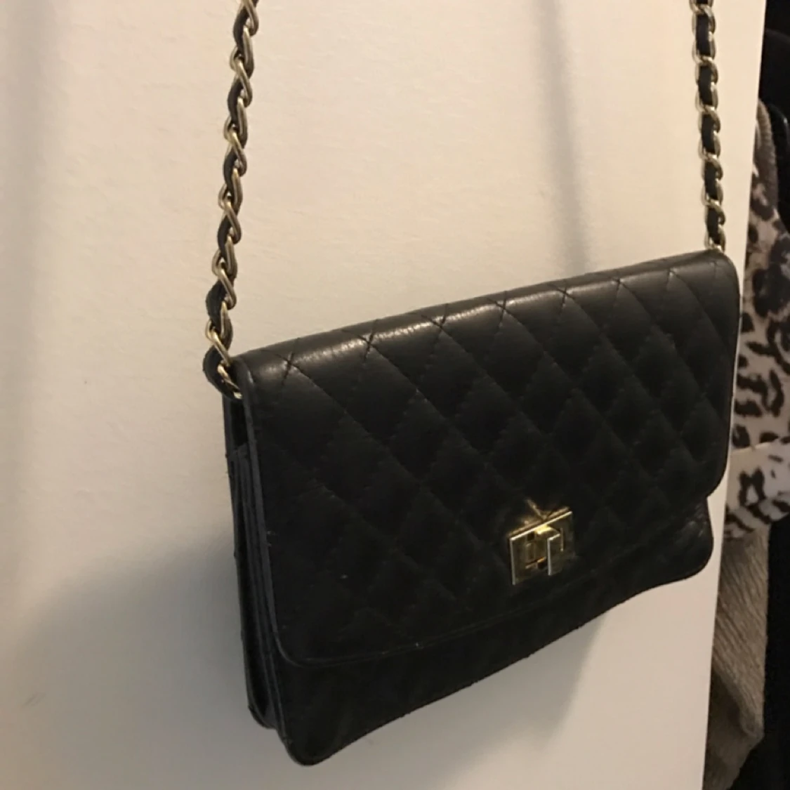 Liten qulitad väska svart med gulddetaljer Mindre kortfack innuti (se bild) brunt innerfoder köpt i London, äkta läder Fint skick o knappt använd, lite sliten på axelkedjan, guldfärgen, i övrigt mycket fin! Inga märken el dylikt nypris 600:-