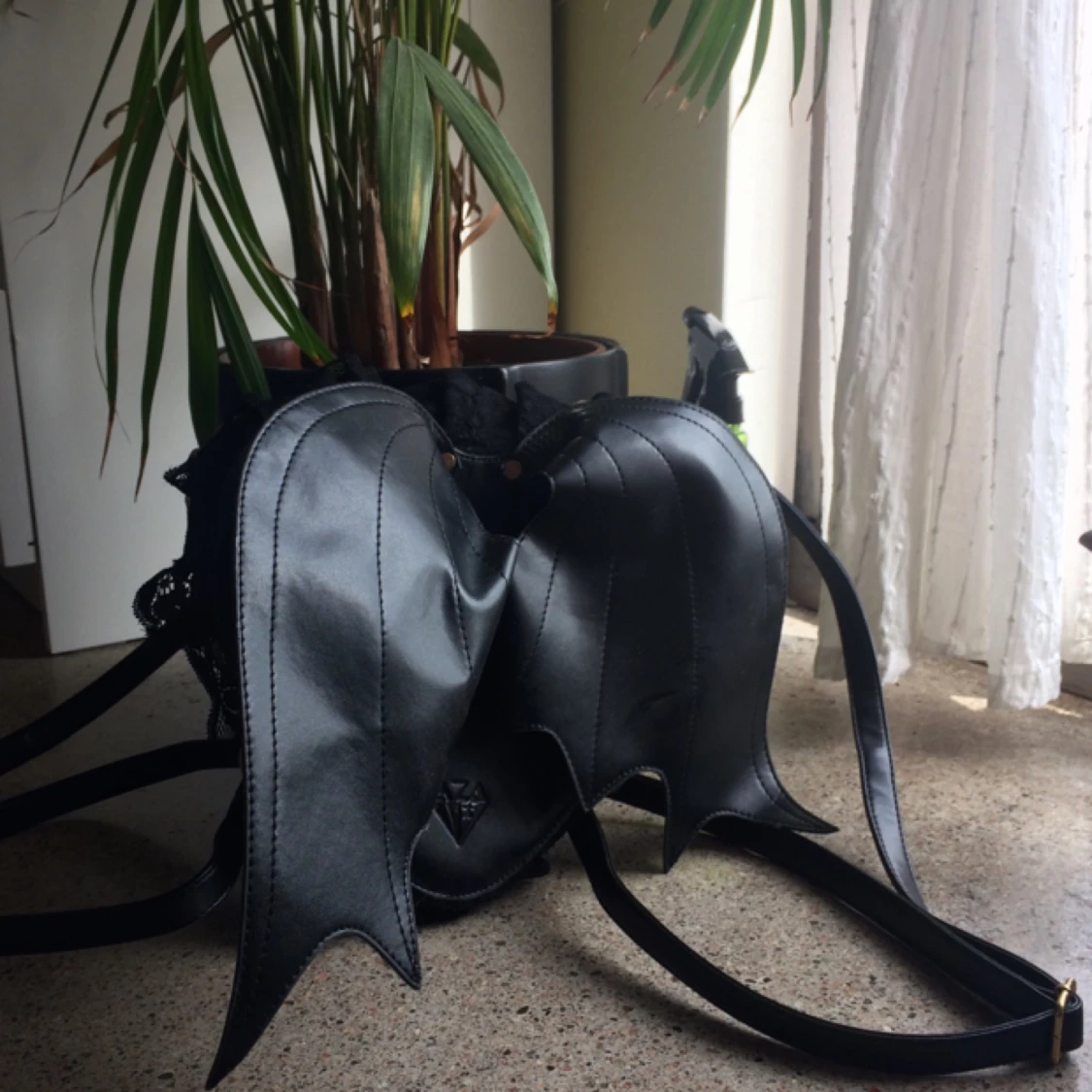 Fortsättning följer på R.I.P. Emo-Lovisa. Supersnygg svart, hjärtformad & vamp ryggväska m. vingar & (wait for it!) spets såklart!! Läderliknande material (ej äkta!! Gotta keep them animals alive)🦇🦇🖤🖤 🌻Mötas i Malmö/Frakt tillkommer🦕 No refunds 🌻