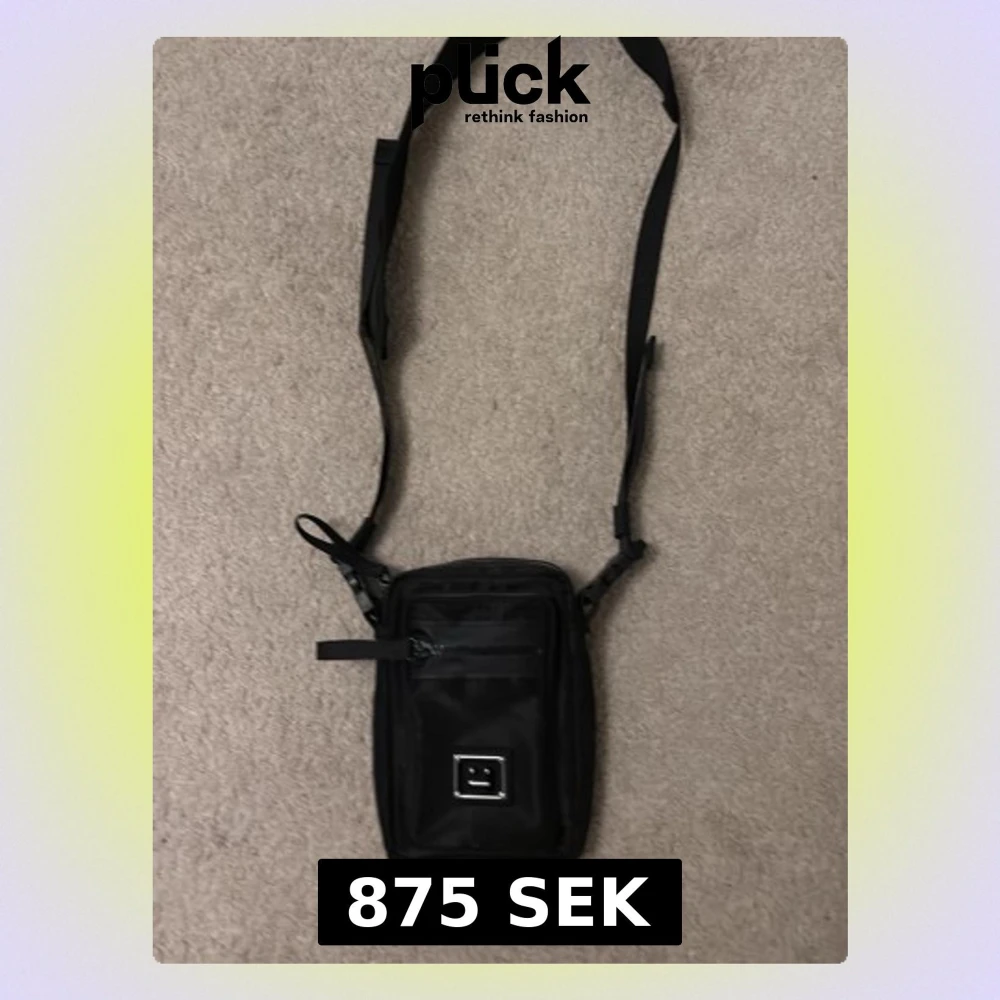 Säljer en svart axelväska från Acne Studios med justerbar rem och praktisk dragkedja framtill. Väskan har ett meshfack på baksidan och ett ikoniskt ansiktsmärke på framsidan. Materialet är slitstark syntet och designen är stilren och modern.