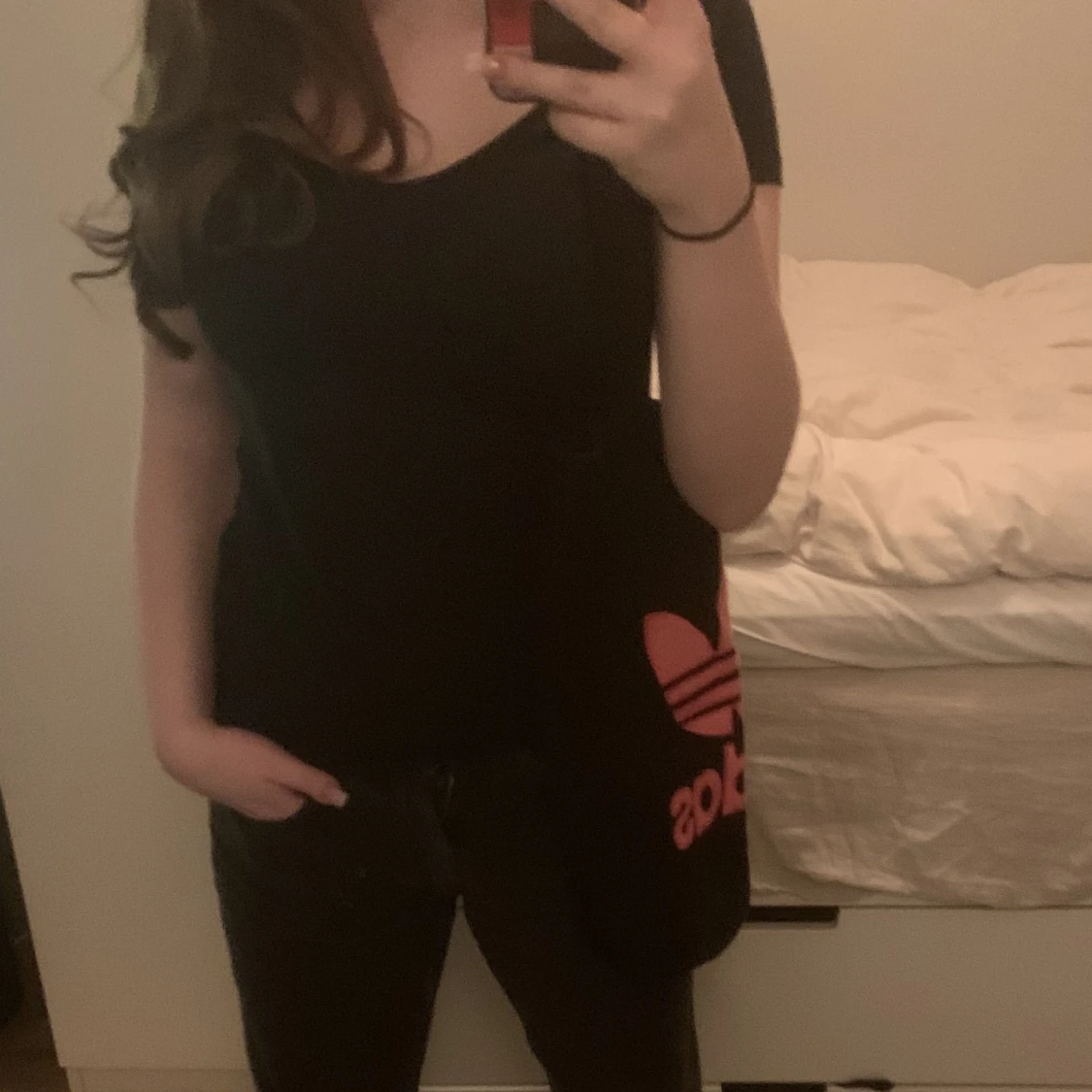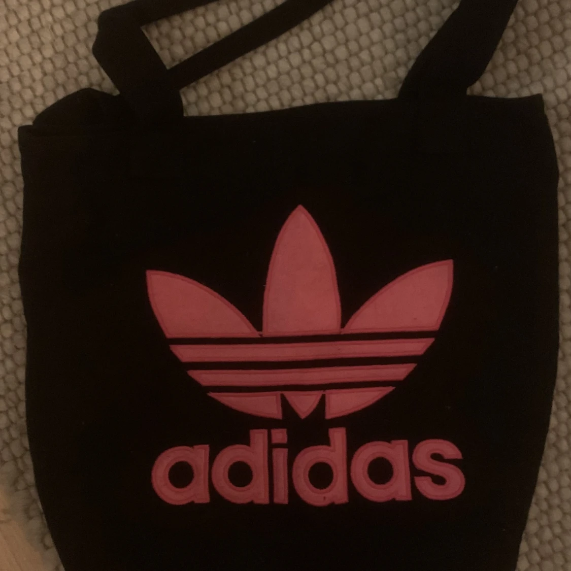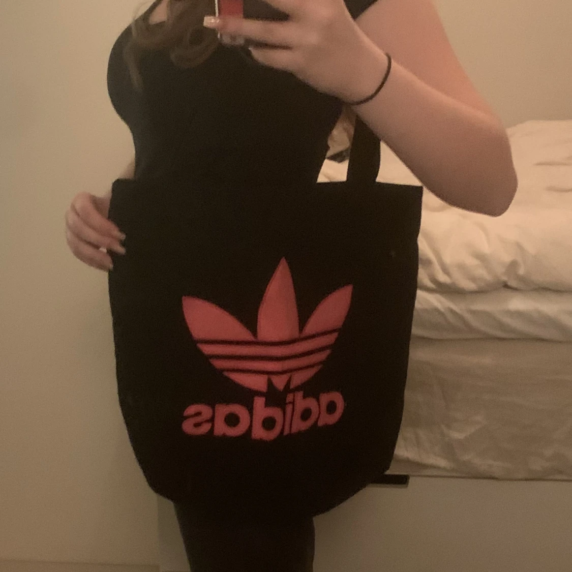 Svart totebag med rosa adidas på framsidan. Den är stor nog för att hålla en dator och är svart på insidan.