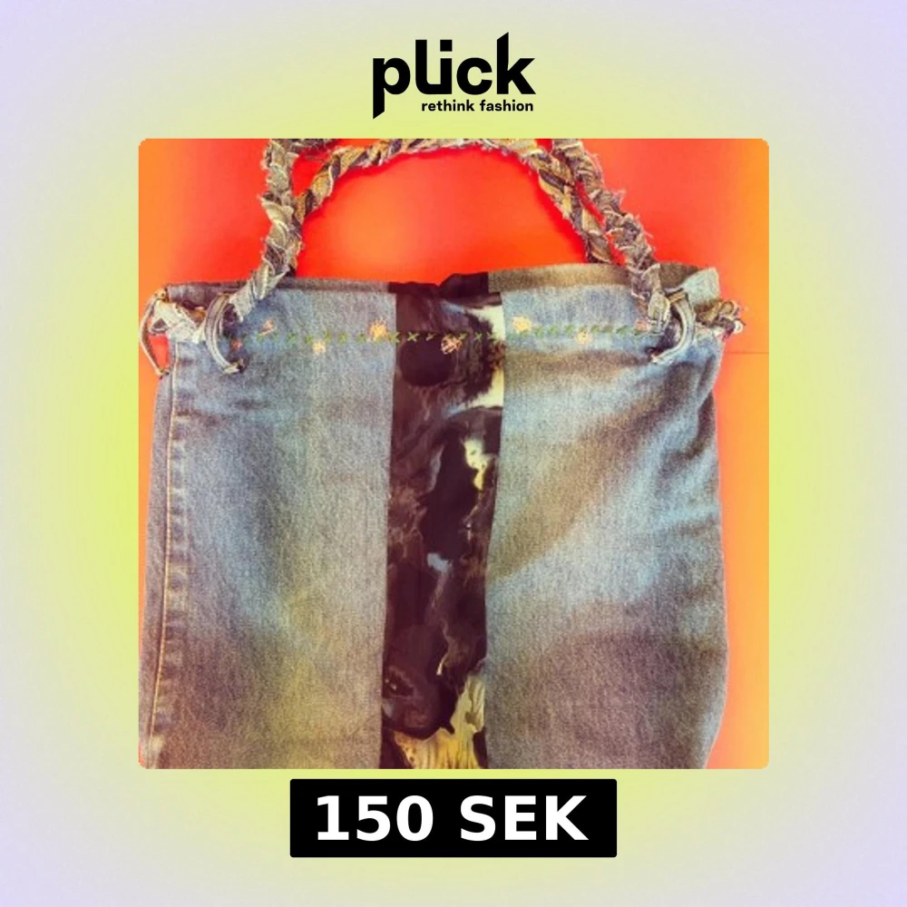 Unik handväska i jeans med flätat handtag och en svartmönstrad mittpanel. Mittpanelen gör så att du kan ändra handväskan till en "påse". (Backsidan är inte backsidan, det är bara hur den ser ut när man drar i handtaget. Den är INTE broderad i baksidan som i framsidan. Annars ser allt likadant ut