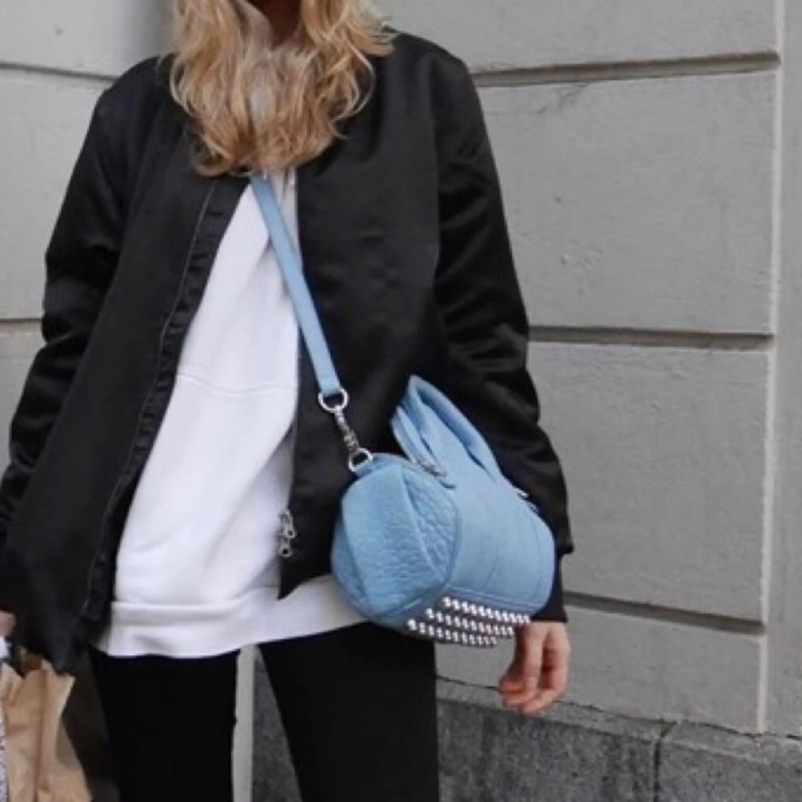 Jättefin Alexander Wang-väska i modellen Rocco. Babyblått strukturerat skinn med silvriga nitar i minsta storleken. Köpt på illums bolighus i Köpenhamn för 3500:- Säljer billigt vid snabb affär.
