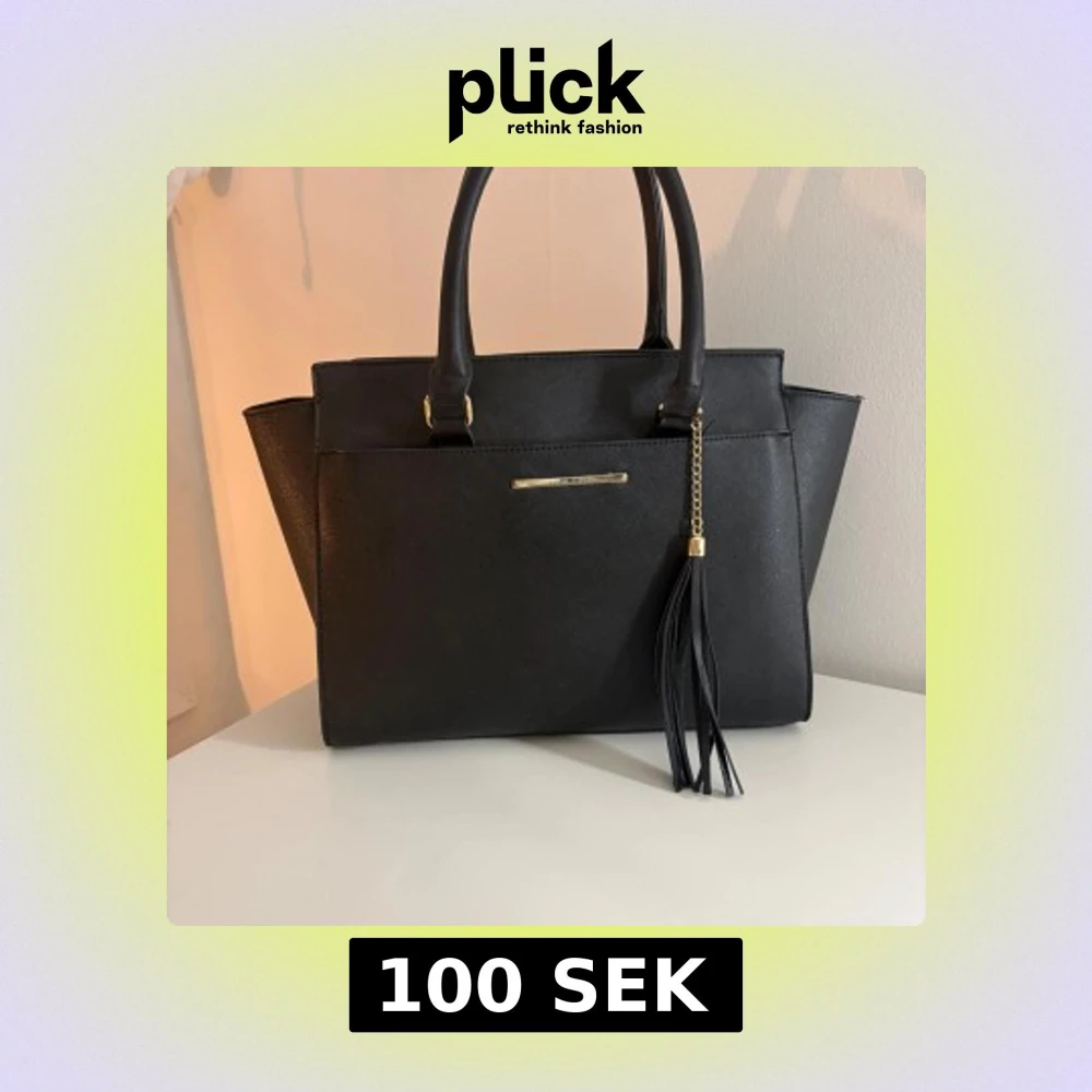 Stilren svart handväska från Anna Field med guldfärgade detaljer och en snygg tofs i skinnimitation. Väskan har två rejäla handtag och en avtagbar axelrem, perfekt för att bära på olika sätt. Klassisk form med strukturerad yta och metallplatta med logga framtill. Använd ett fåtal gånger men inga defekter💞