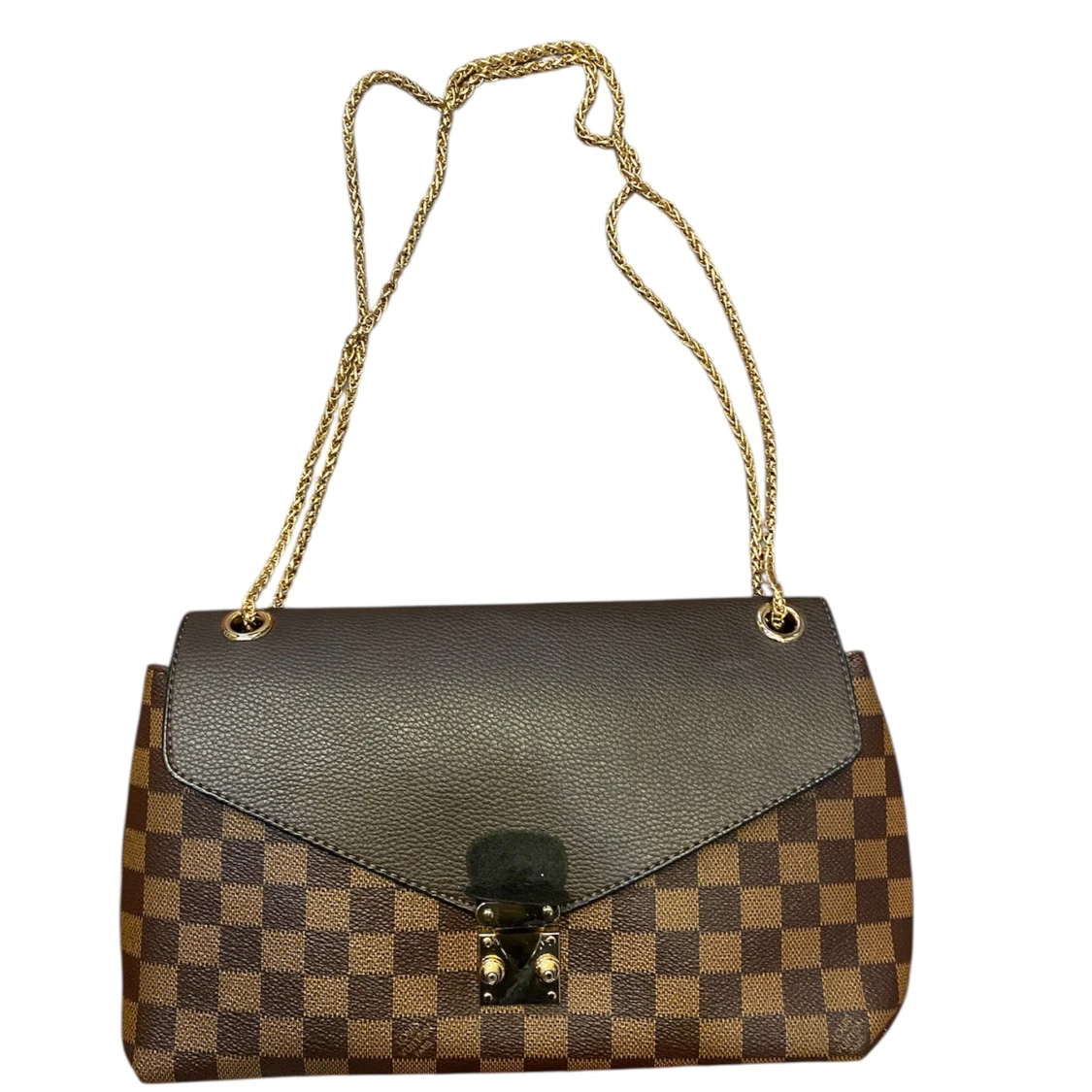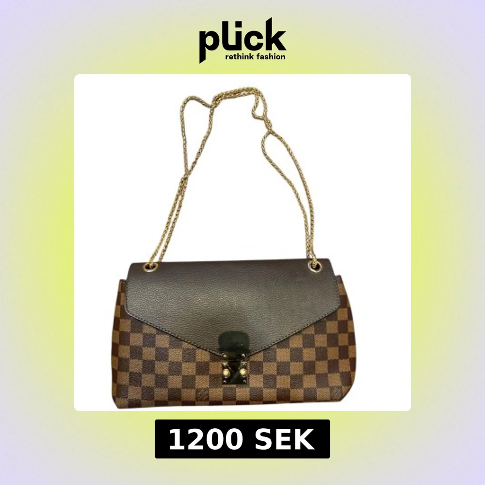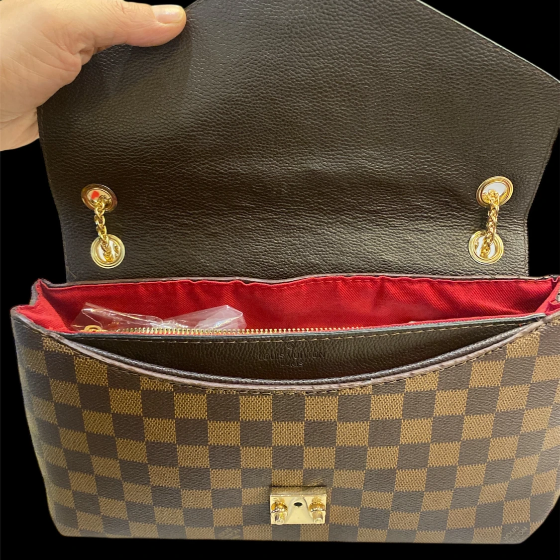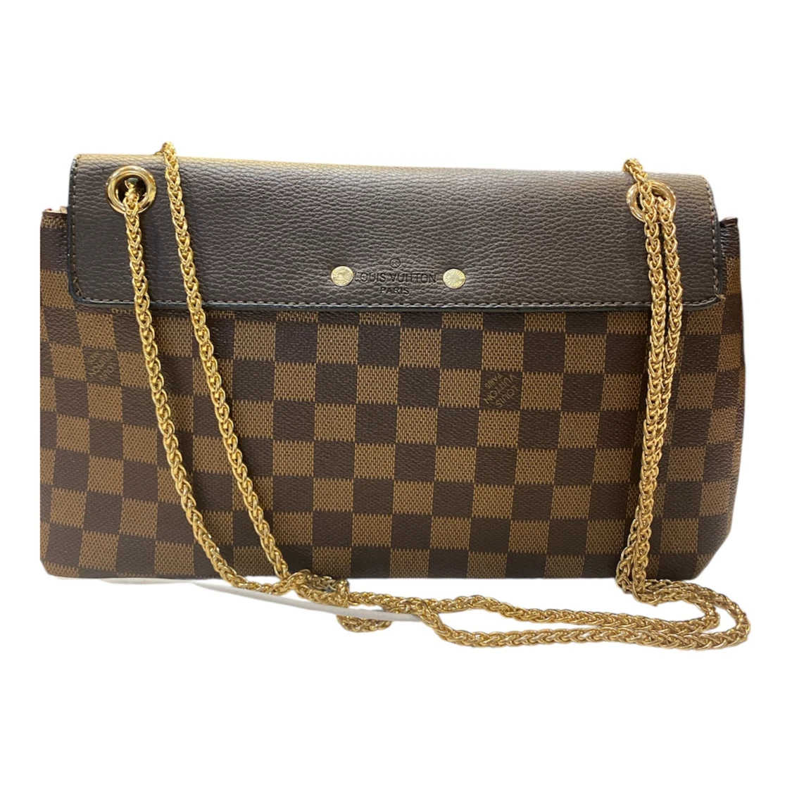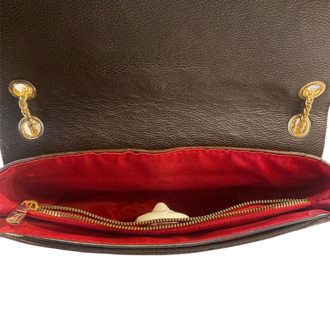 Snygg axelväska . Väskan har guldfärgad kedja som axelrem, lock i mörkbrunt skinn och röd insida med dragkedja. Perfekt storlek för det viktigaste och har exklusiva detaljer.