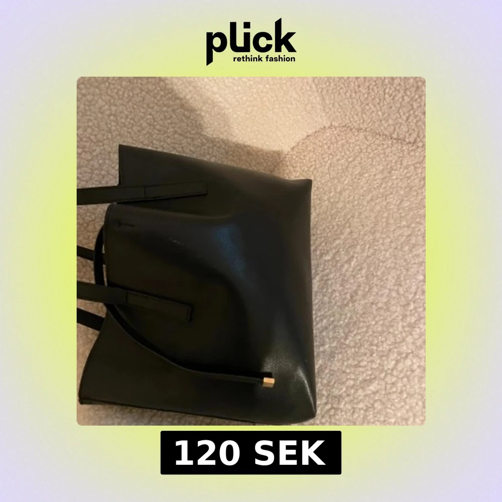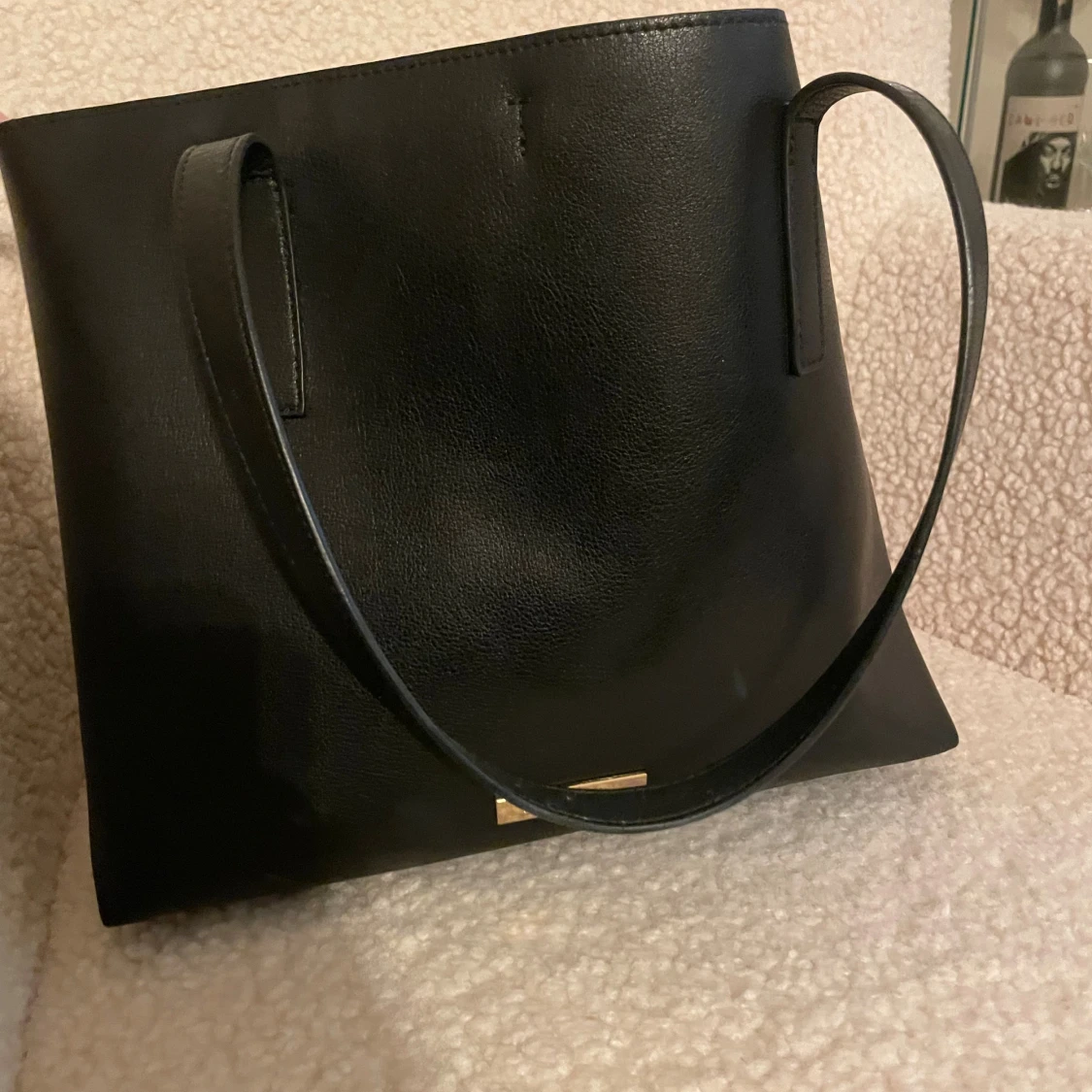 Stilren svart axelväska i skinn med minimalistisk design och raka linjer. Väskan har långa handtag och en liten gulddetalj på framsidan. Perfekt storlek för att få plats med allt du behöver och passar till många olika outfits.