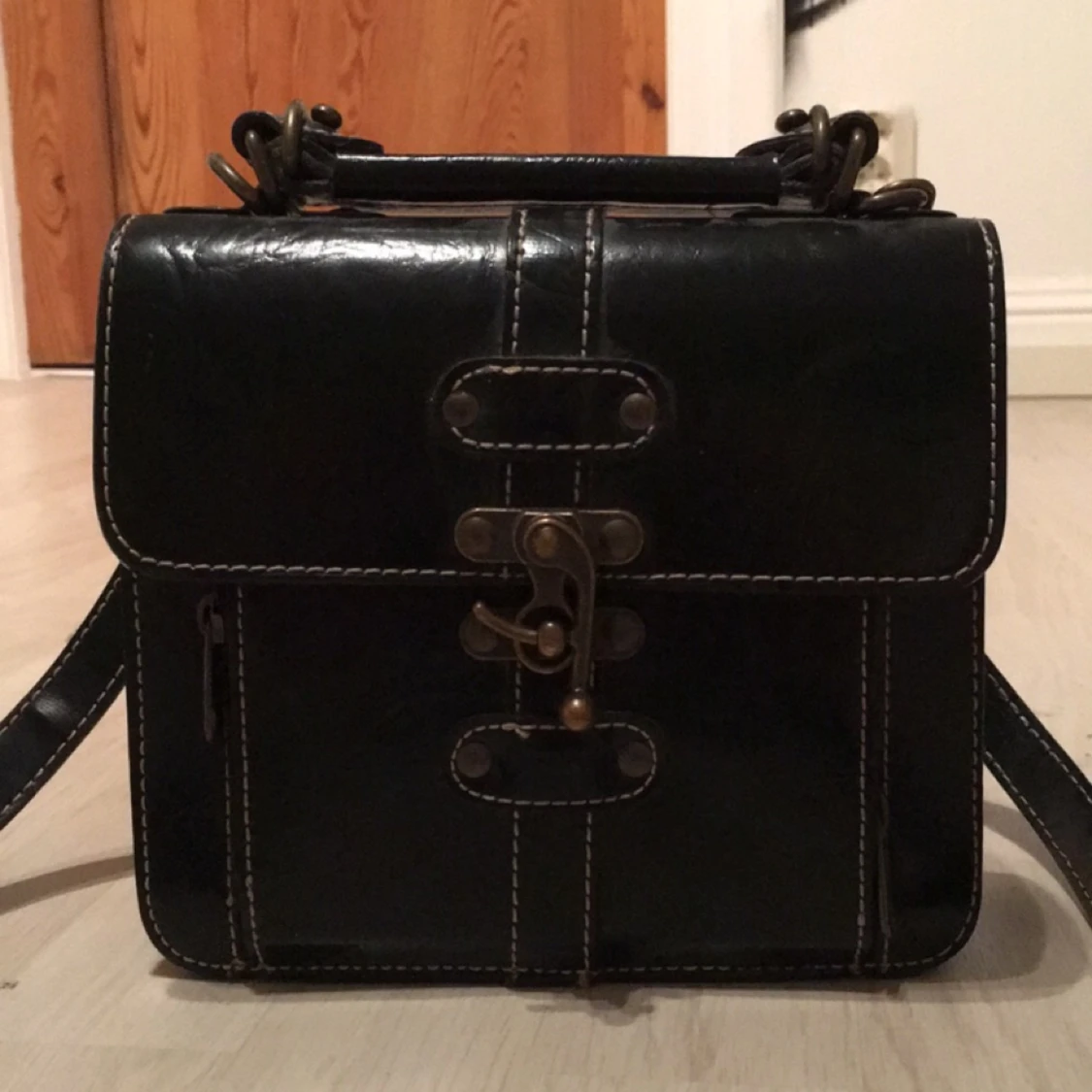 Liten snygg retroväska i skinn med antika detaljer och axelband. Finns även ett litet handtag och man väljer att ta bort axelbandet. Perfekt att ha sina viktigaste tillhörigheter i nu när sommaren närmar sig och klänningen åker på! Finns att hämta i stockho