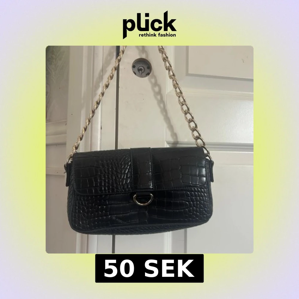 Snygg svart axelväska från Missguided med croco-mönstrad yta och guldfärgad kedja som axelrem. Väskan har ett stilrent rektangulärt lock med metallring framtill och innerfack med dragkedja. Perfekt för dig som vill ha en trendig och elegant look.