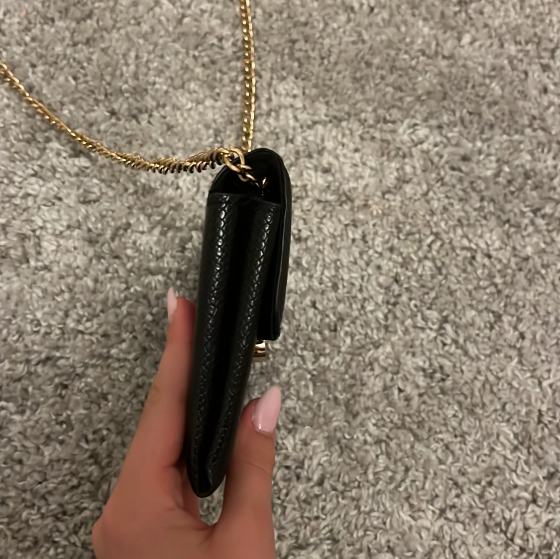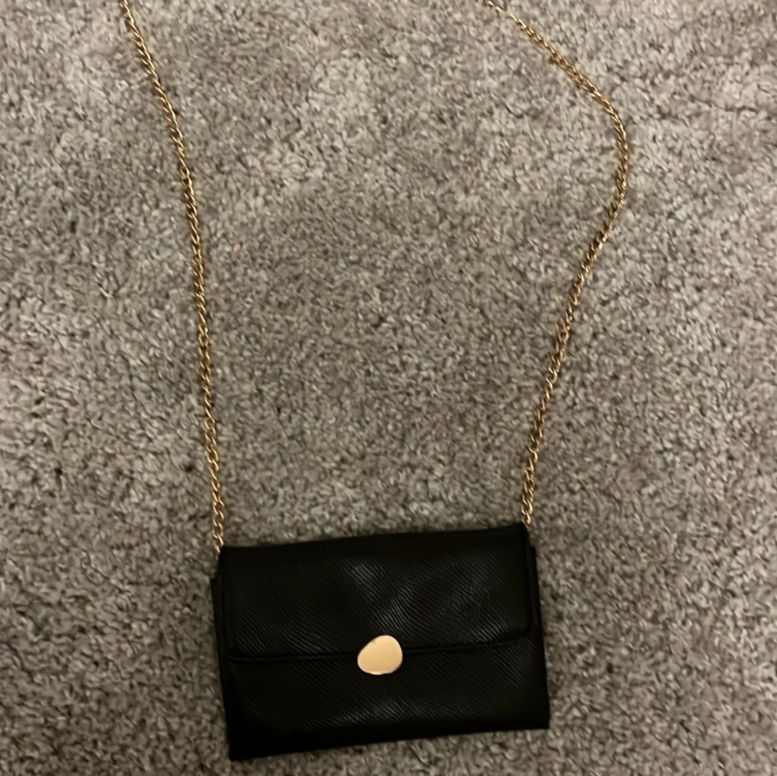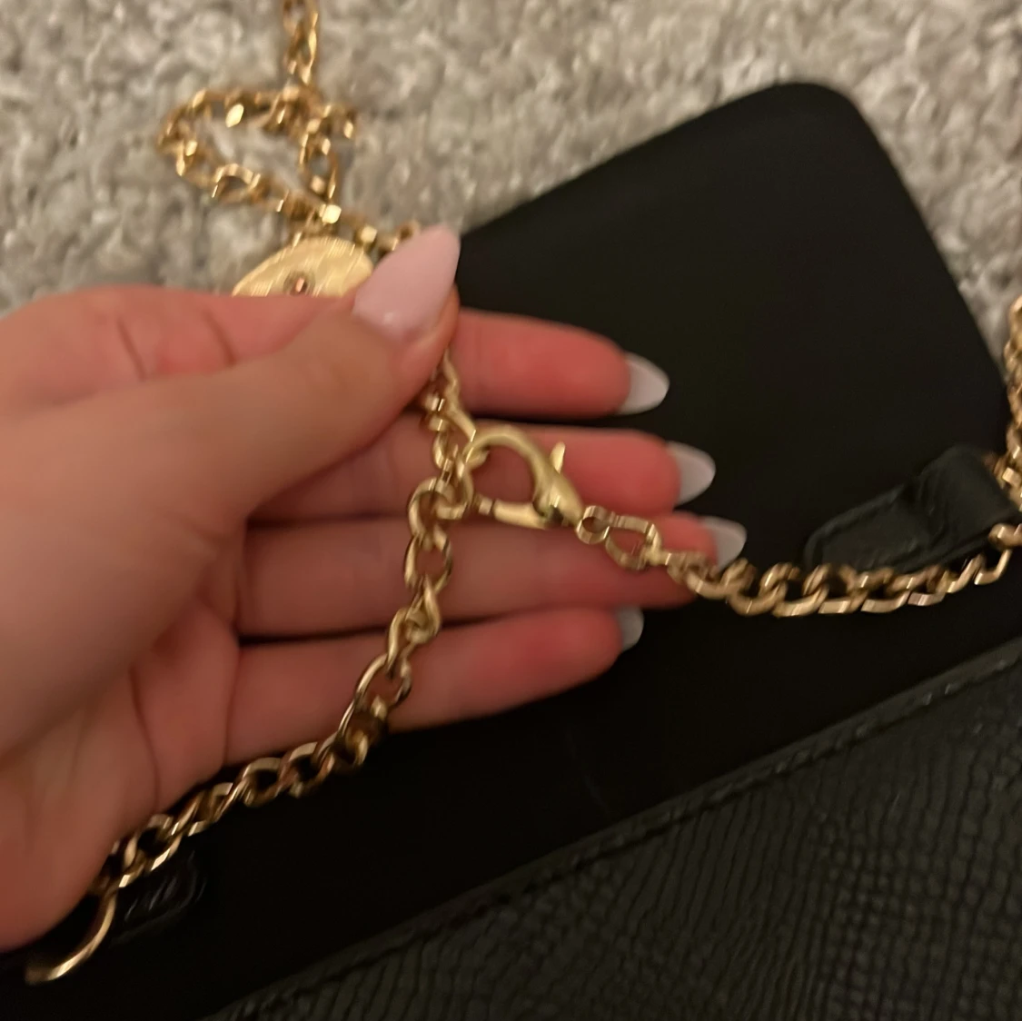 Super fin väska från glitter med guld kedja och guld knapp mitt på. Kedjan går att göra längre och kortare inuti är silver tjej så kommer ej till andvändning 💓