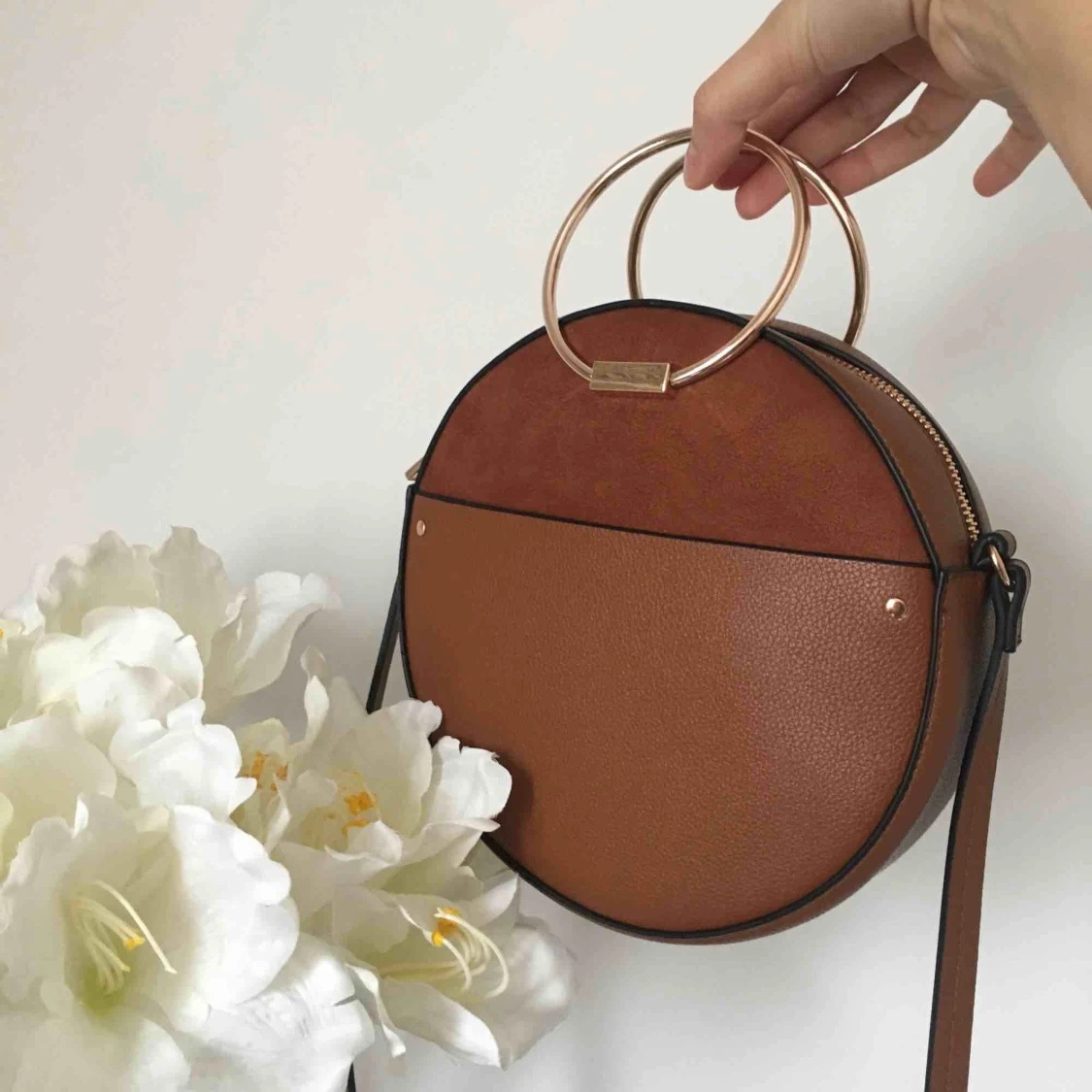En snygg och rund väska med guldiga handtag och faux mocka detaljer. Köptes på H&M men aldrig använd. Perfekt till sommaren och festivaler! 200 kr Köparen står för frakten Möts upp Göteborg