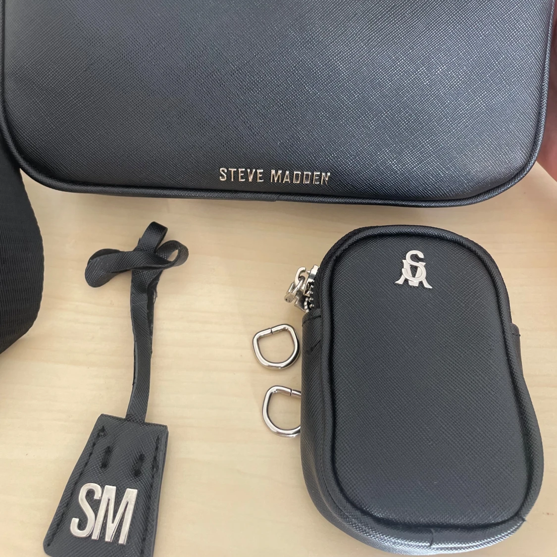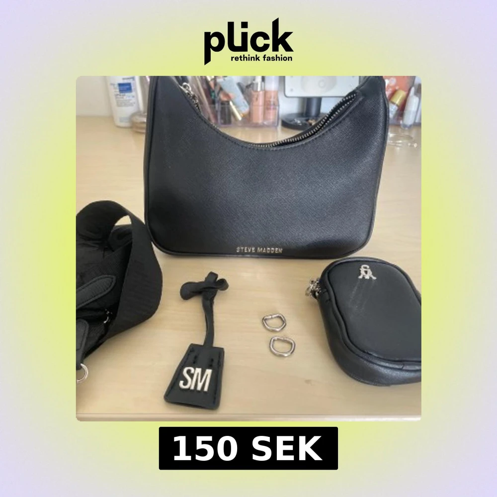 Snygg svart axelväska från Steve Madden i syntetmaterial med silvriga metalldetaljer och dragkedja. Ringarna som höll fast kedjan till väskan har gått av men det går att fixa (därav priset) Utöver det är väskan som ny! Inga fläck eller slitage. Väskan har även avtagbar rem, extra liten pouch med logga och SM-tag.