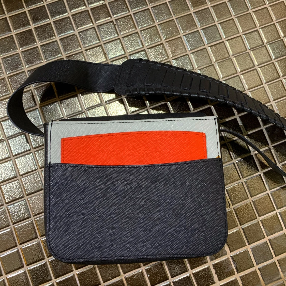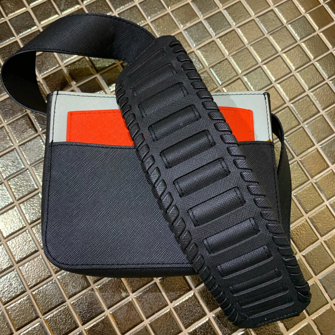 Supersnygg och unik axelremsväska som man även kan använda som axelväska. Snyggt band och en röd ficka som är justerbar då man kan sätta på och ta av❣️❣️ Väskan är formad som en fyrkantig box och rymmer därför mycket 🤩 Frakt 50kr men kan även mötas upp