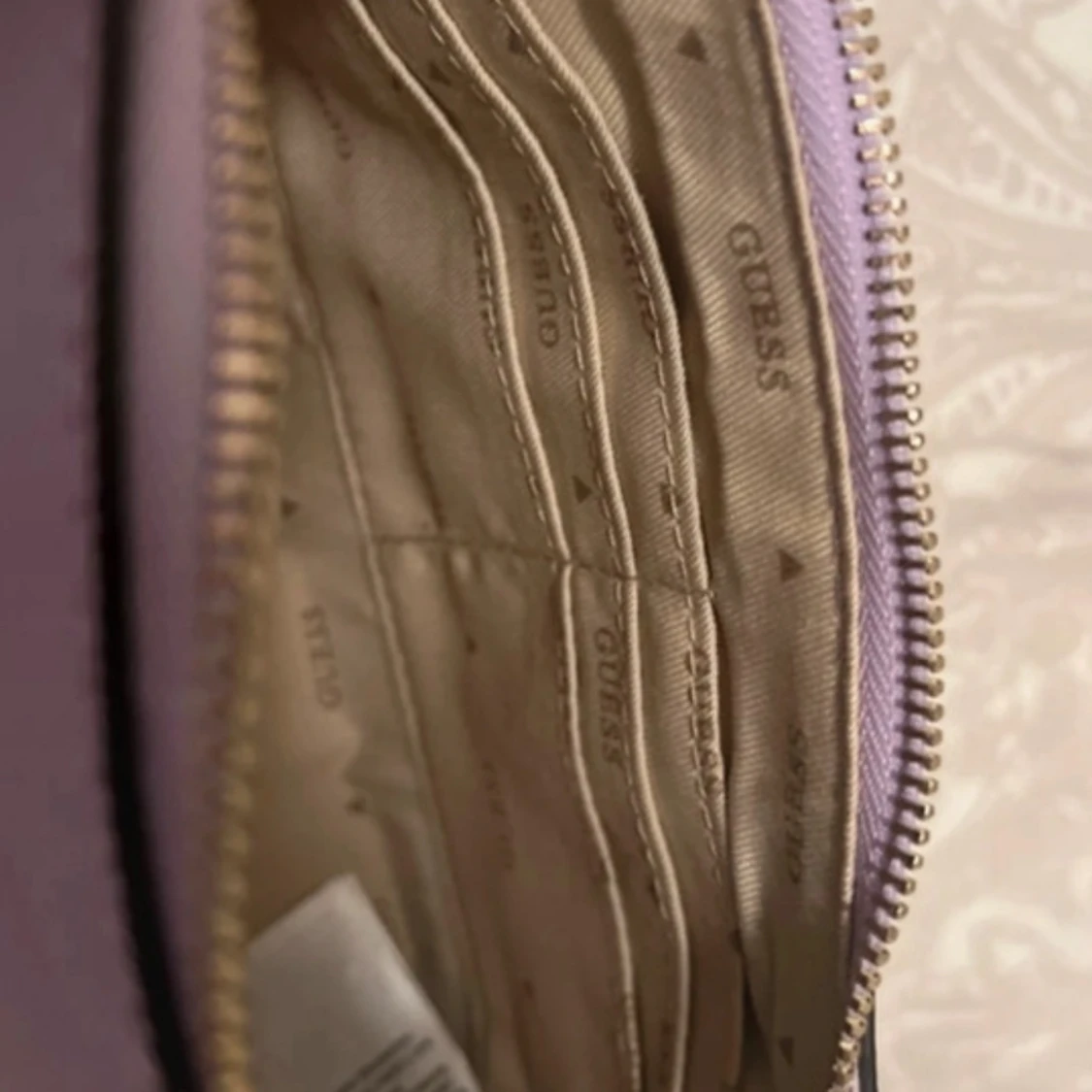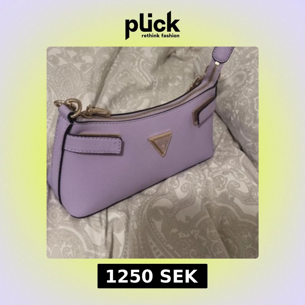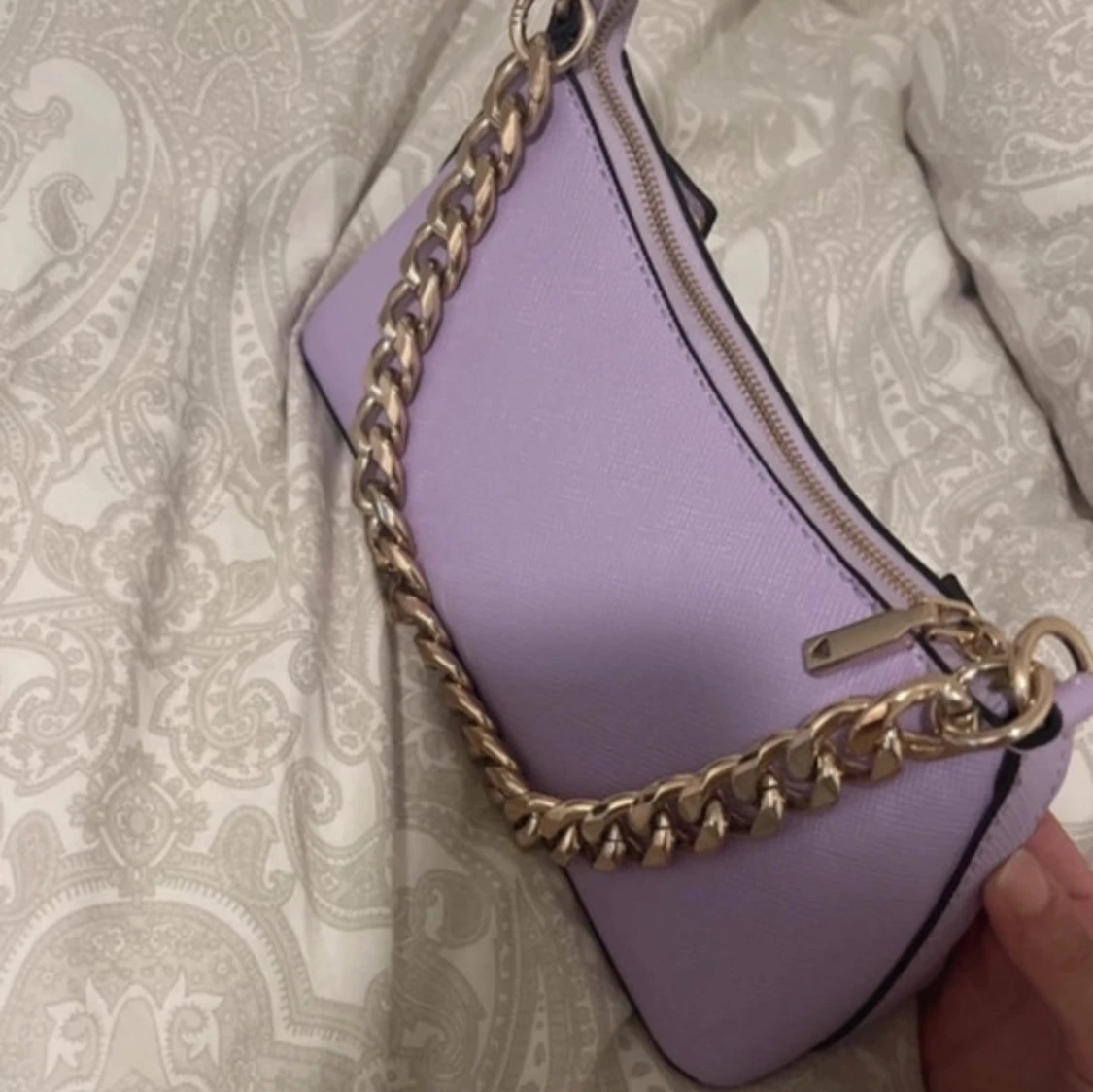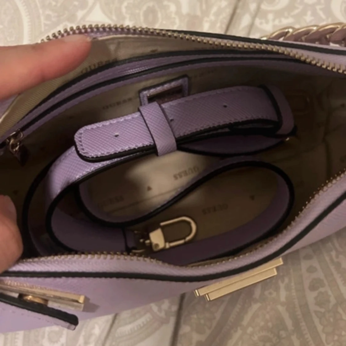 Superfin lila axelväska från Guess med guldfärgad kedja och dragkedja upptill. Väskan har ett klassiskt Guess-triangelmärke framtill och flera fack inuti för kort och småsaker. Tillverkad i syntetmaterial med stilren design och justerbar axelrem. Aldrig använd