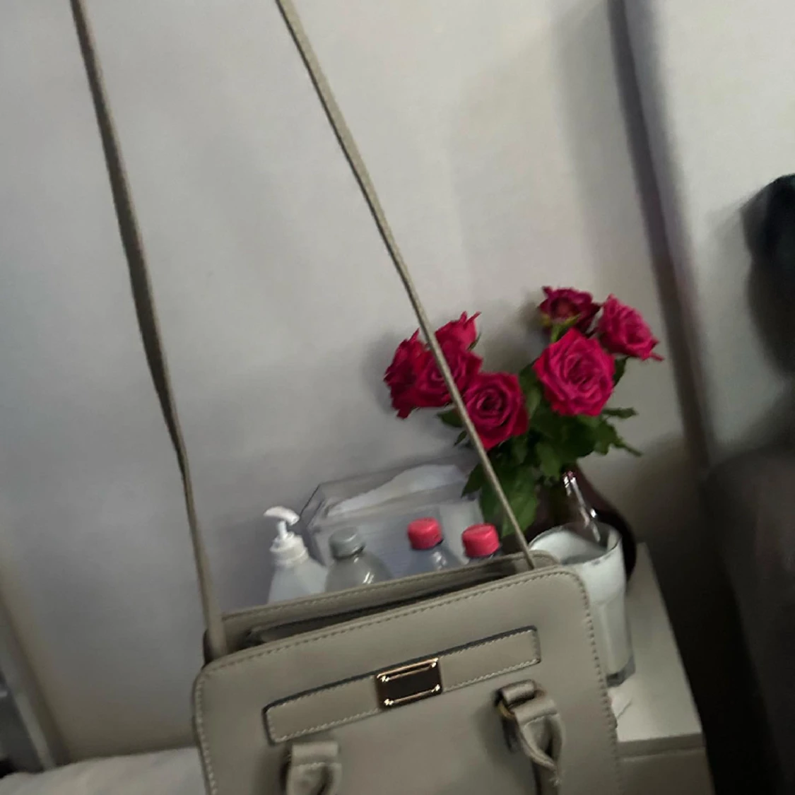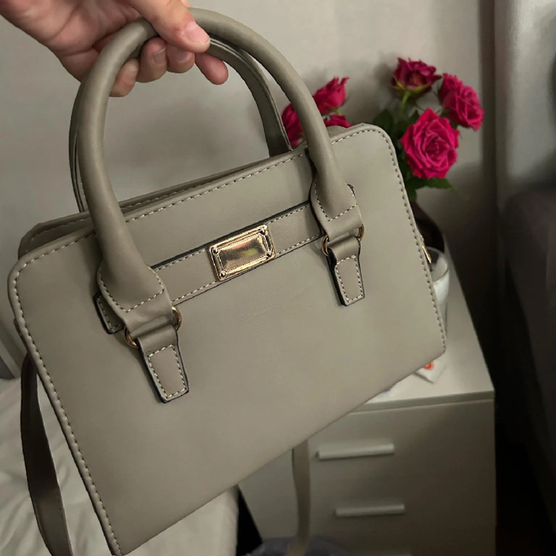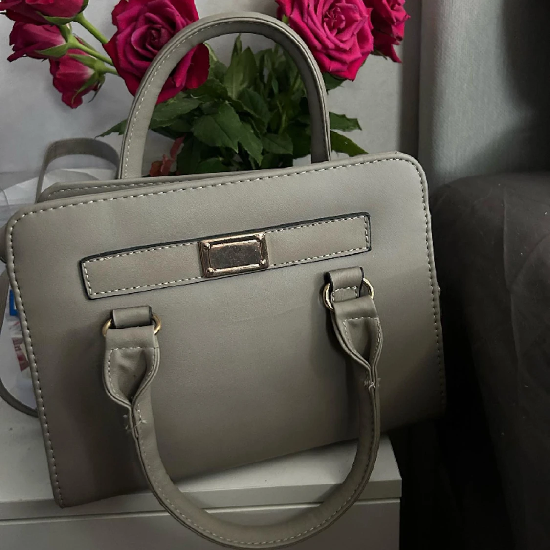 Säljer min fina axelremsväska som är grå med guldiga detaljer. Har en inner dragkedja och två handtag. Man kan ta av sätta på axelremmen.