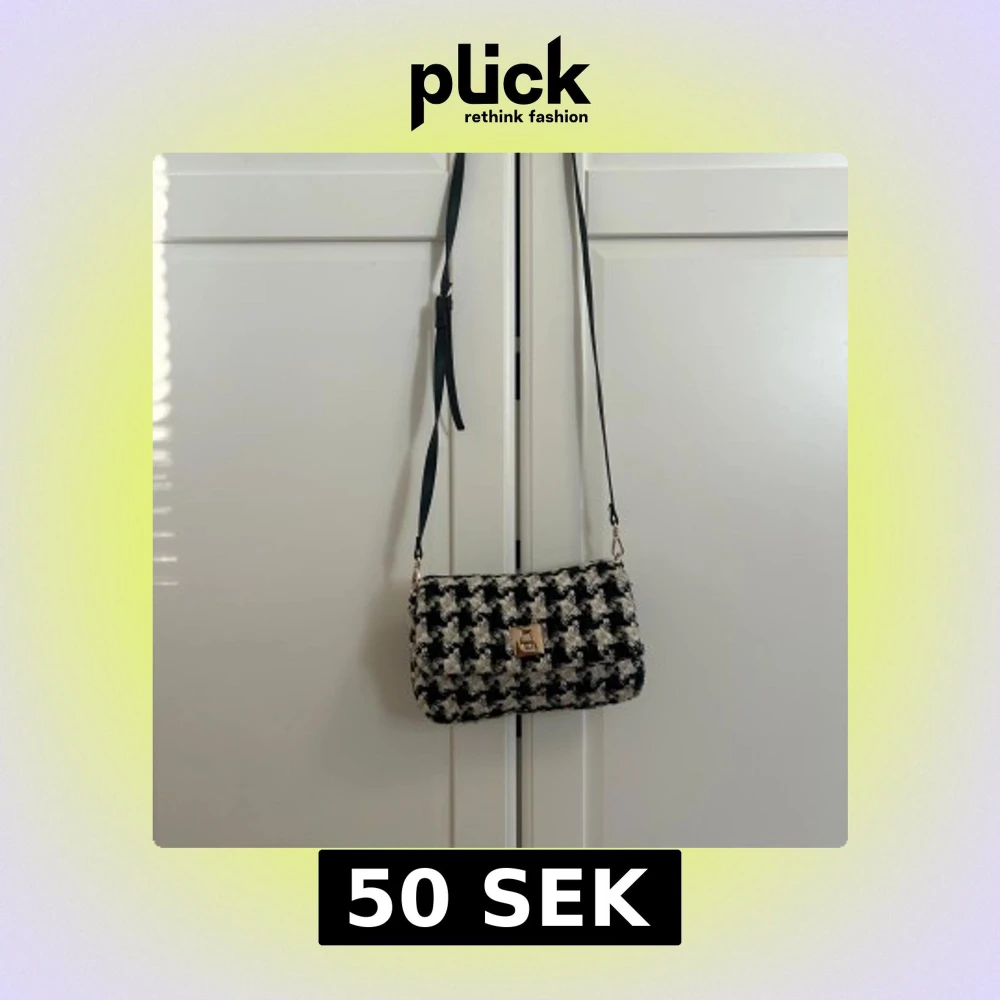 Snygg axelväska med rutigt svart och vitt mönster, mjukt tyg och justerbart svart axelband. Väskan har guldfärgat spänne framtill och en trendig, fluffig känsla. Perfekt för att lyfta din outfit med en cool detalj.