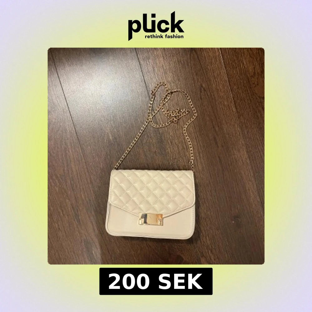 Säljer en snygg beige axelväska med quiltad framsida och guldfärgad kedja.