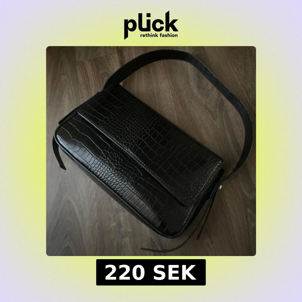 Säljer en svart axelväska i krokopräglat skinnimitation med bred axelrem. Väskan har ett stilrent och elegant utseende med lock och silverfärgad knappdetalj på sidan. Perfekt för dig som vill ha en trendig accessoar med lyxig känsla.