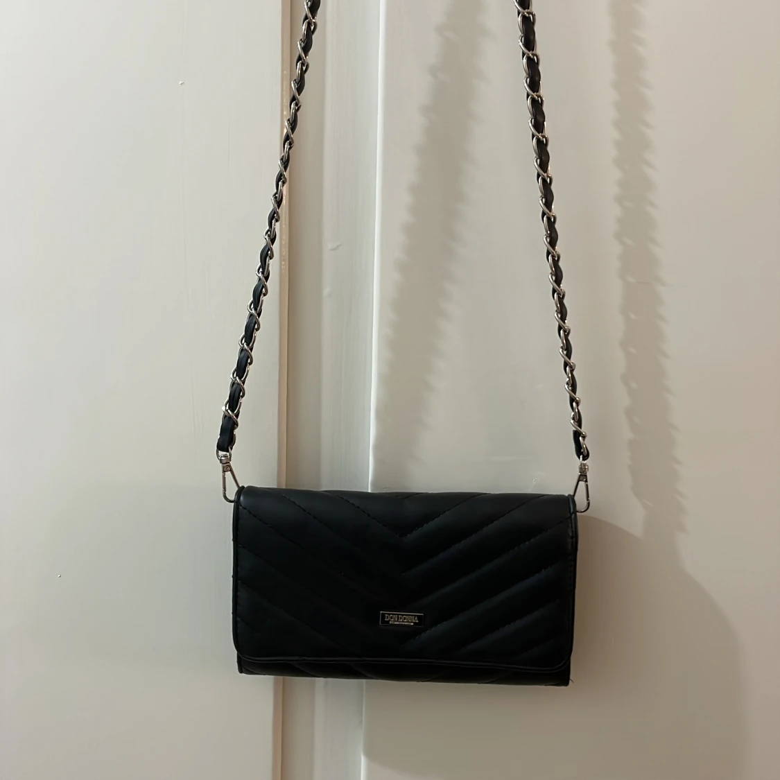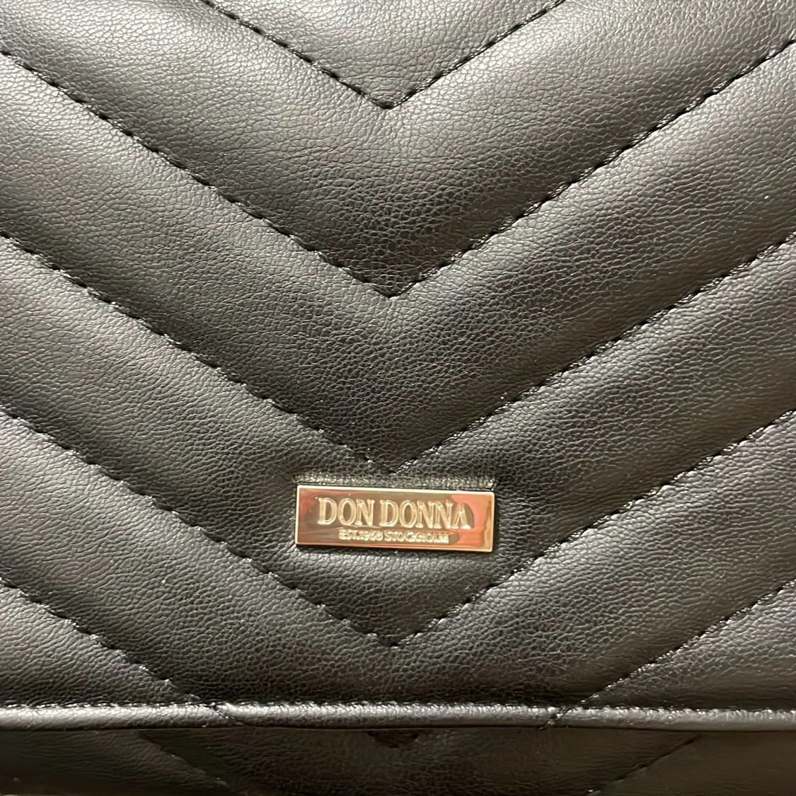 Snygg svart axelväska från Don Donna med quiltad design och kedjedetaljer på axelremmen. Väskan har en praktisk dragkedja inuti och är perfekt för att bära dina viktigaste saker. Mått: bredd 21 cm, höjd: 12 cm. 3 invändiga fack varav ett med dragkedja.