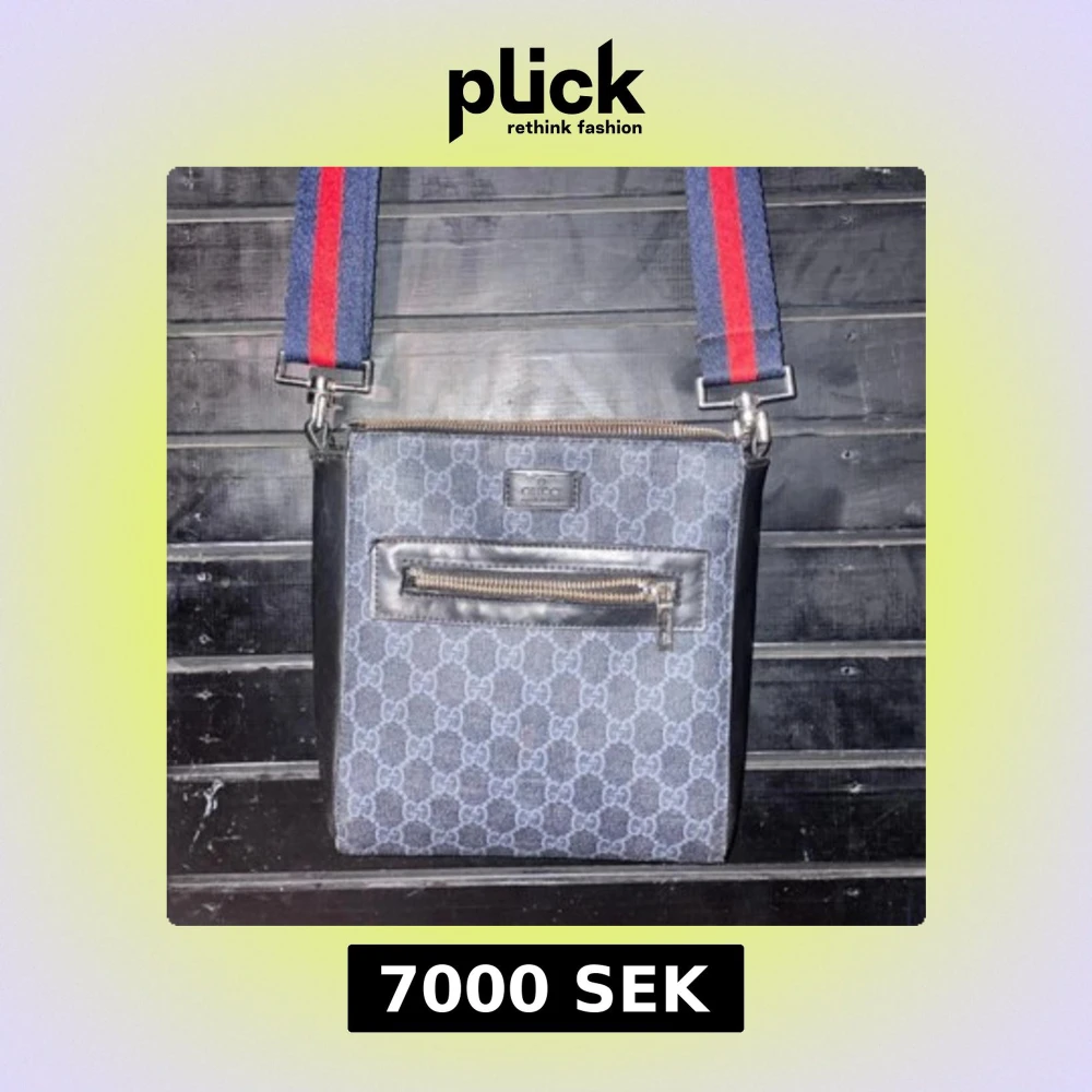 Snygg axelväska från Gucci med ett klassiskt mönster i grått och svart. Väskan har en justerbar axelrem i blått och rött samt en praktisk dragkedja framtill. Perfekt för att bära med sig det viktigaste med stil.