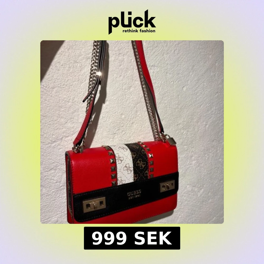 Snygg röd axelväska från Guess med kedjeaxelrem och dekorativa nitar. Väskan har ett svart och vitt mönster med logotypdetaljer och en praktisk dragkedja på baksidan. Väskan är i nytt skick och är perfekt för att ge din outfit en färgklick! Väskan är nypris 1399kr men jag säljer den för 999kr.