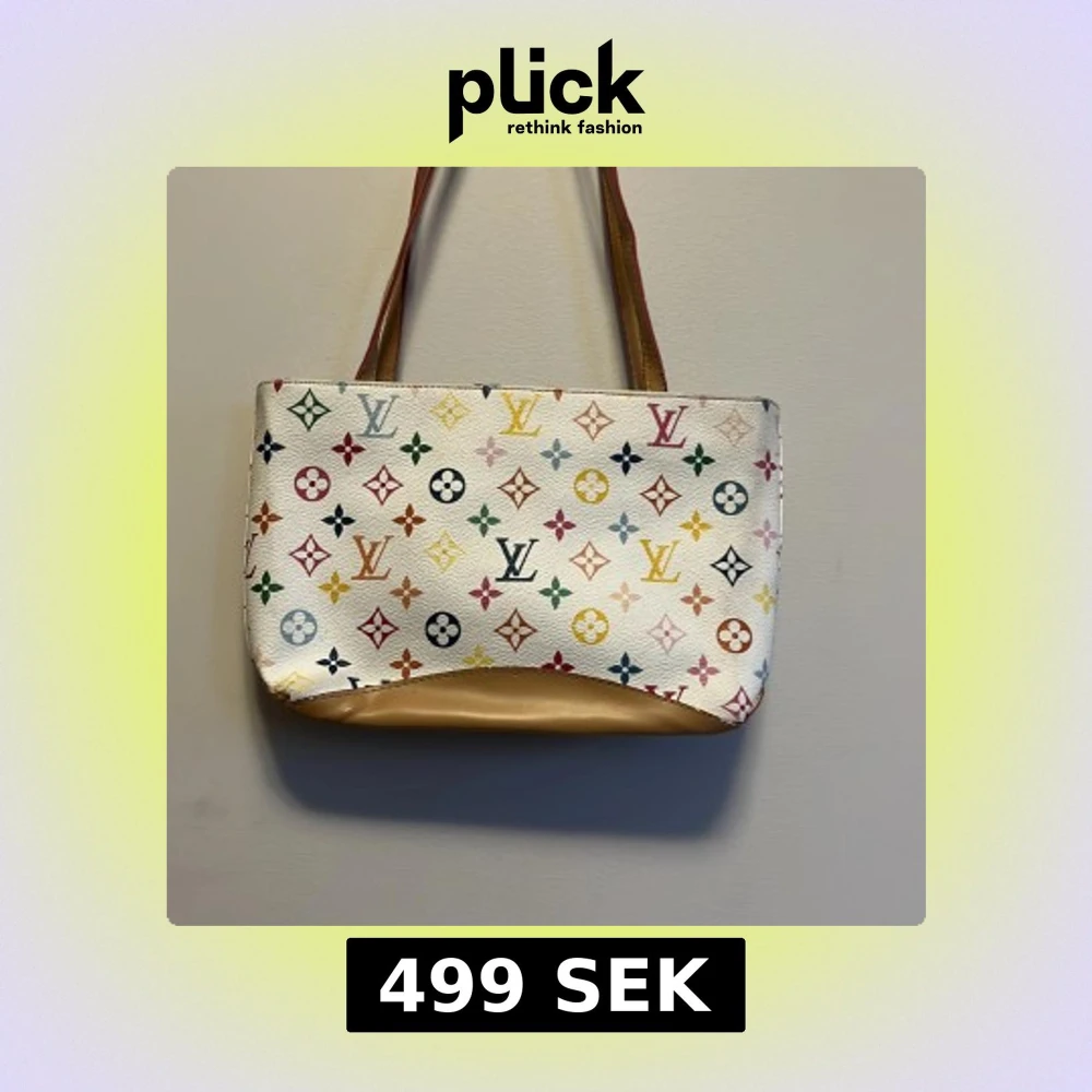 Snygg vit axelväska med ett färgglatt monogrammönster. Väskan har en dragkedja upptill och bruna handtag. Insidan är fodrad med ett mörkt tyg med monogram. Perfekt för att ge en färgklick till din outfit!
