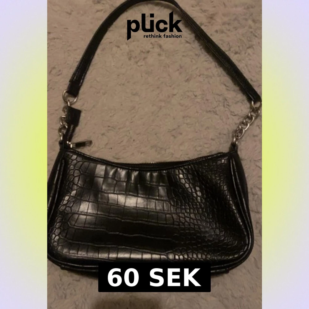 En axelväska i skinn och silvriga kedjor, Den är perfekt storlek då den inte är för liten eller för stor. Den är köpt från glitter.