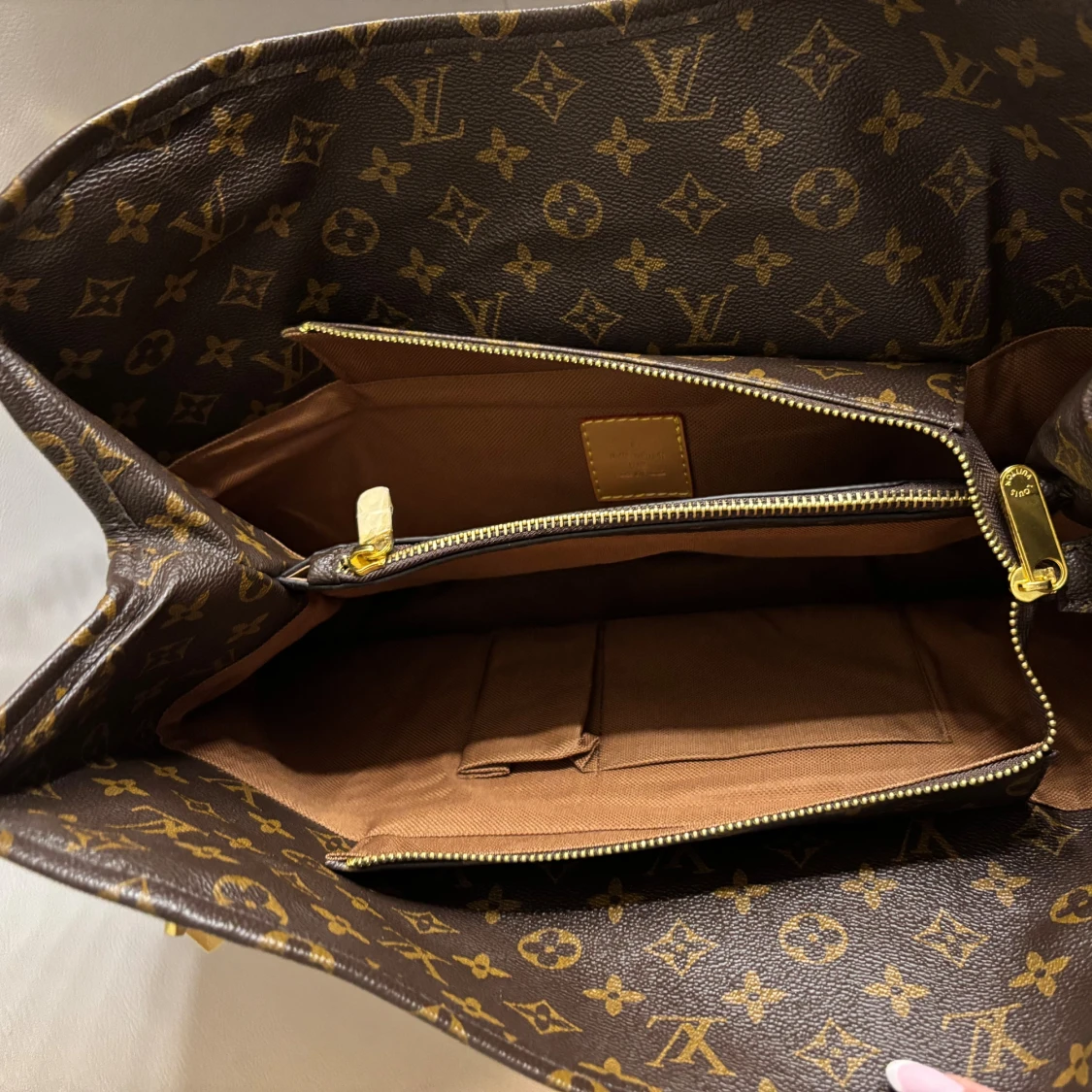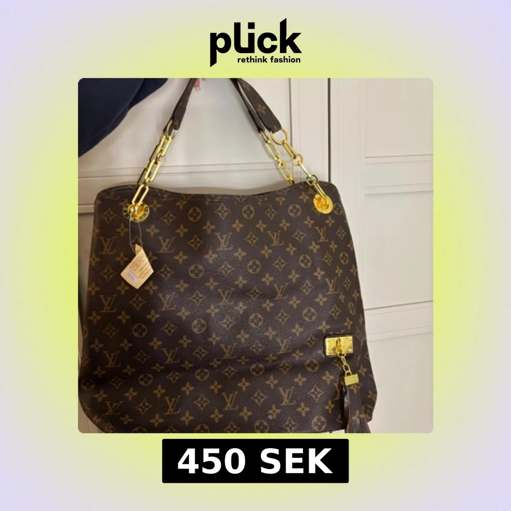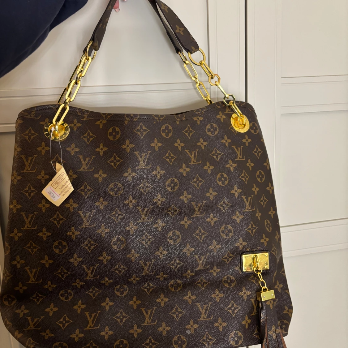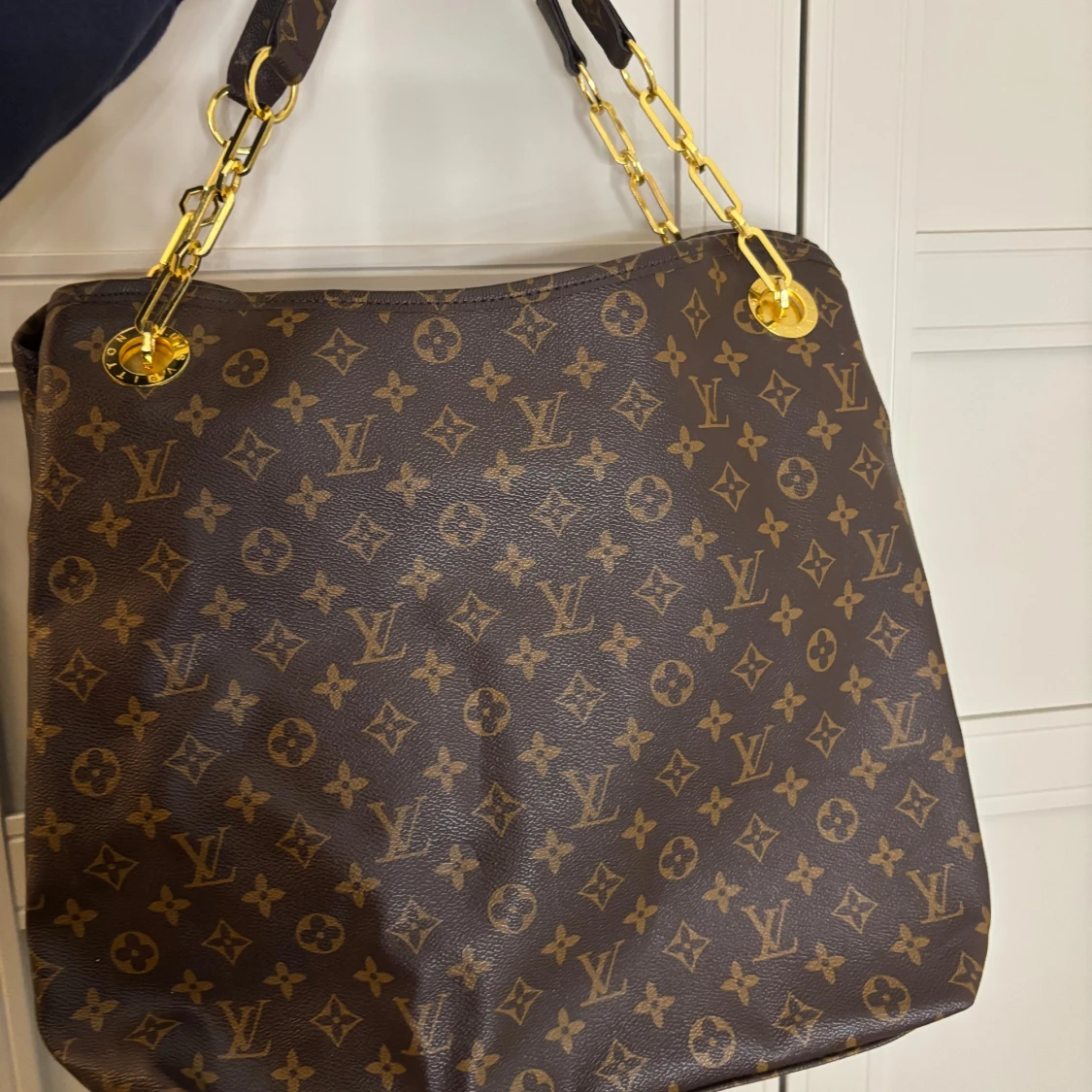 Snygg axelväska i klassiskt monogrammönster. Väskan är brun med guldiga metalldetaljer och kedjor, tillverkad i skinn. Rymligt fack med dragkedja och innerfickor, perfekt för dig som vill ha både stil och funktion.