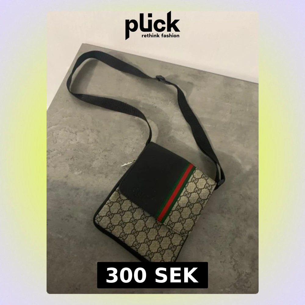 Snygg axelväska med klassiskt GG-mönster i beige och svart, samt detaljer i svart skinn. Väskan har gröna och röda ränder på framsidan och en praktisk dragkedja på baksidan. Perfekt storlek för mobil och småsaker.