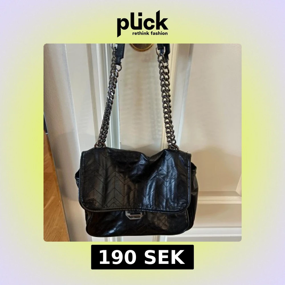 Bra skick, lite sönder i ytterfacket men går att sy ihop! Svart axelväska i skinn med quiltat mönster och kedjerem. Väskan har ett lock med metallspänne och fyra fack inuti, ett med dragkedja.