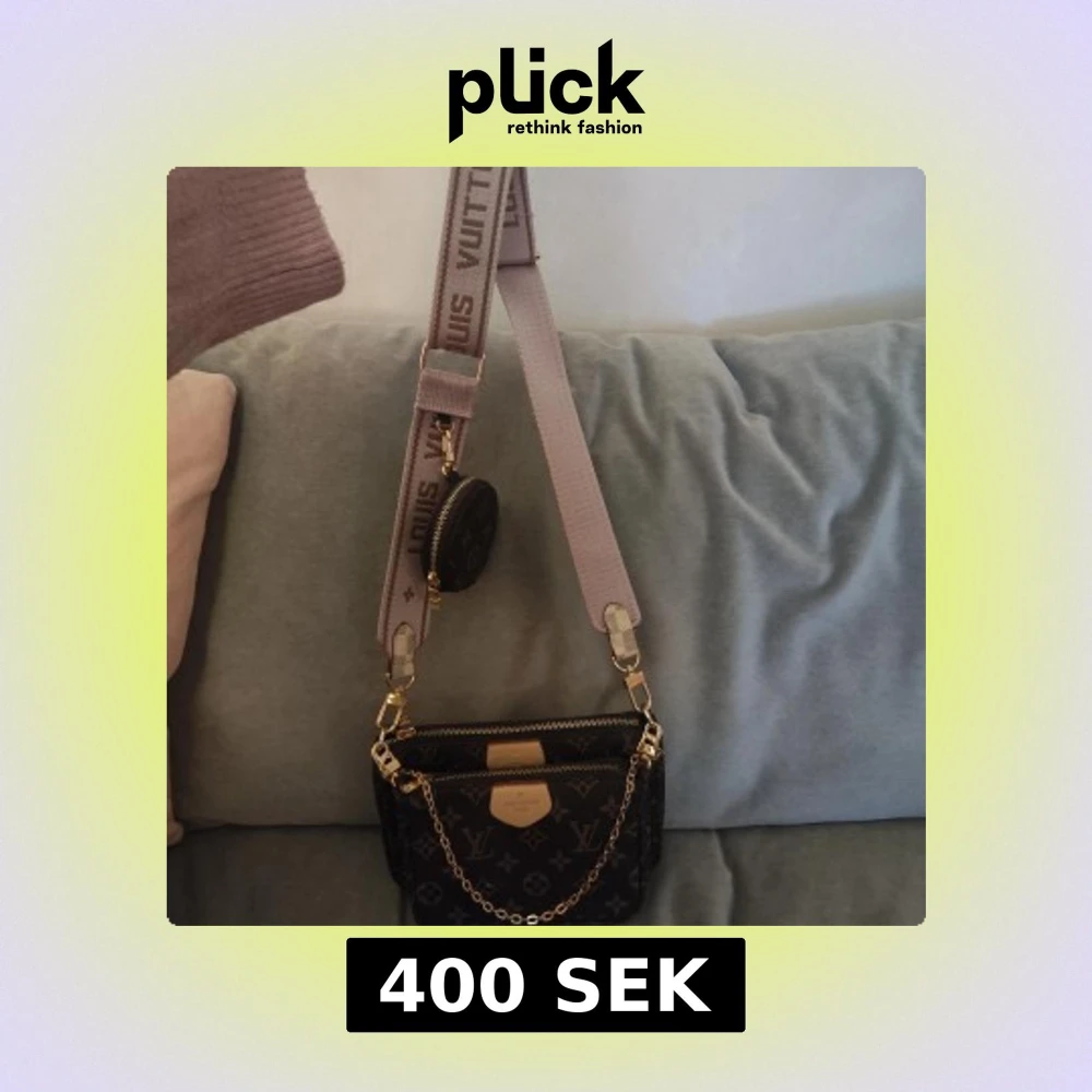 Säljer en snygg axelväska från i klassiskt monogrammönster. Väskan har bred rosa axelrem med logga, guldfärgade metalldetaljer och en liten rund myntplånbok fäst på remmen. Perfekt för dig som vill ha en trendig accessoar. Aldrig använd