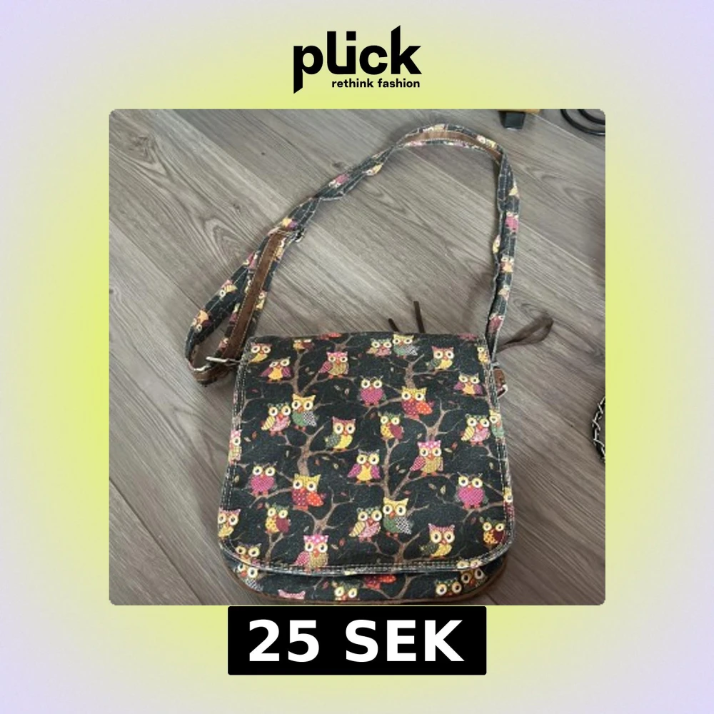 Säljer en axelväska med färgglatt ugglemönster på mörk bakgrund. Väskan har flera fack, både med och utan dragkedja, och en justerbar axelrem. Materialet är troligtvis polyester och insidan är ljusbeige. Perfekt för dig som gillar unika detaljer och djurmotiv.