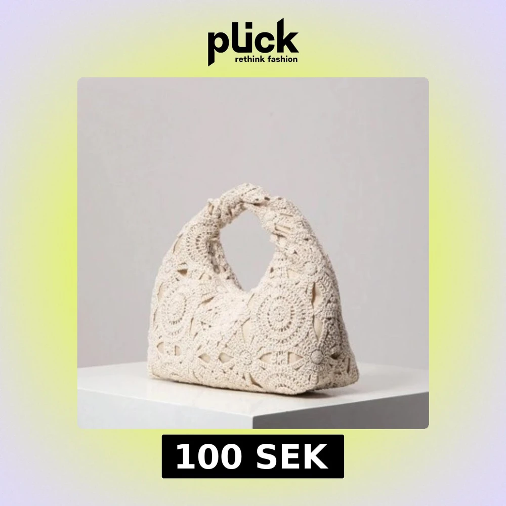 Superfin beige axelväska med virkat mönster och rundad form. Väskan har ett handtag upptill och är perfekt för att addera en bohemisk touch till din outfit. Den är lätt och smidig att bära med sig och passar till många olika stilar.