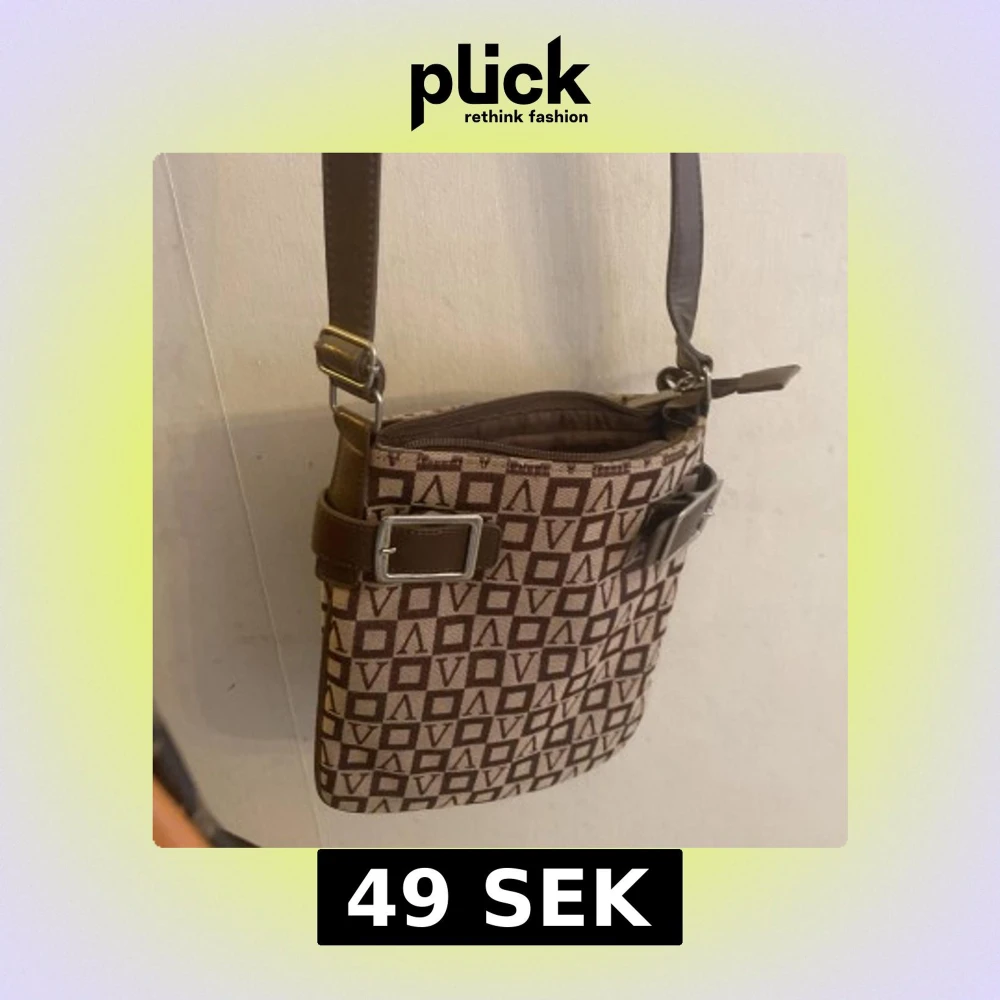Snygg brun axelväska med geometriskt mönster och justerbar axelrem. Väskan har en praktisk dragkedja och dekorativa spännen på sidorna. Perfekt för att bära dina dagliga nödvändigheter med stil.