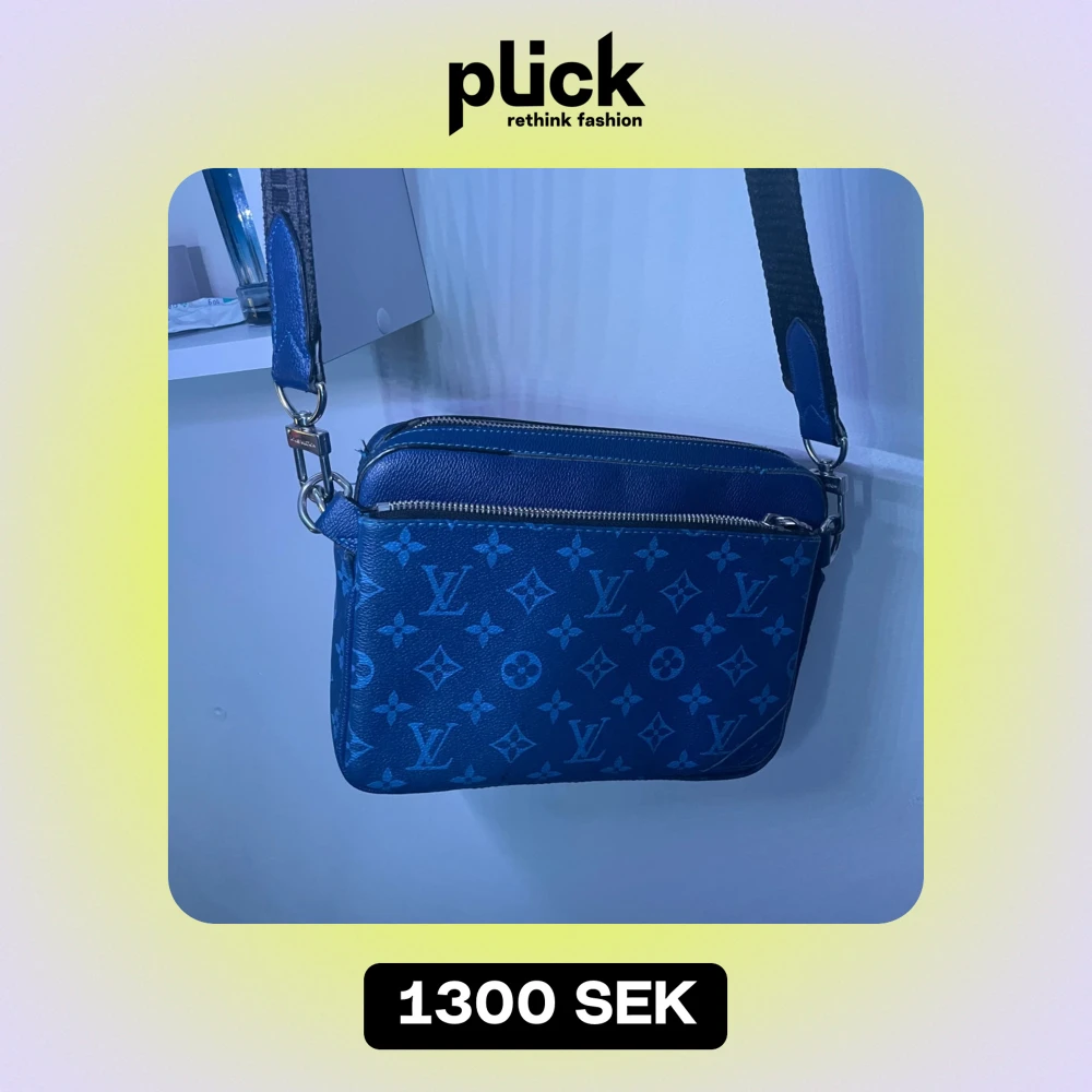 Snygg blå axelväska med klassiskt monogrammönster. Väskan har en justerbar axelrem och en praktisk dragkedja upptill. Perfekt för både vardag och festliga tillfällen. Den är i mycket bra skick och redo att användas direkt!