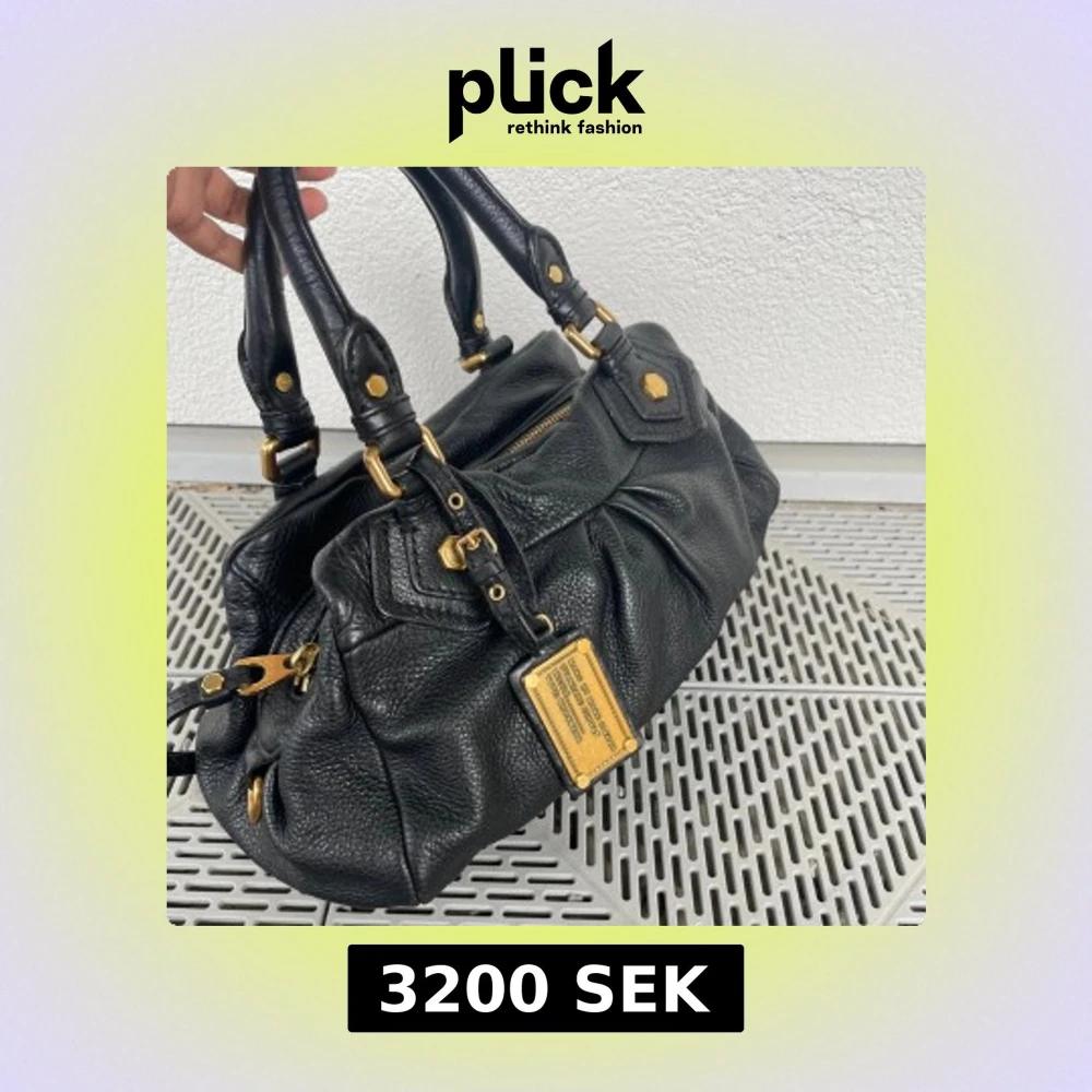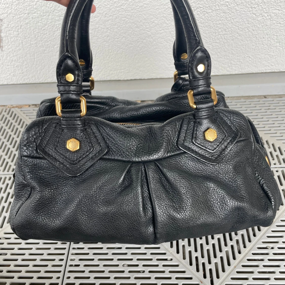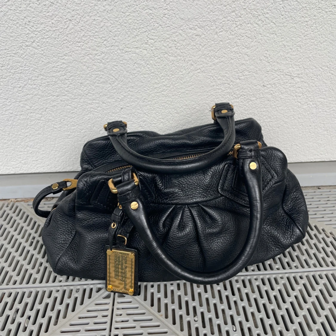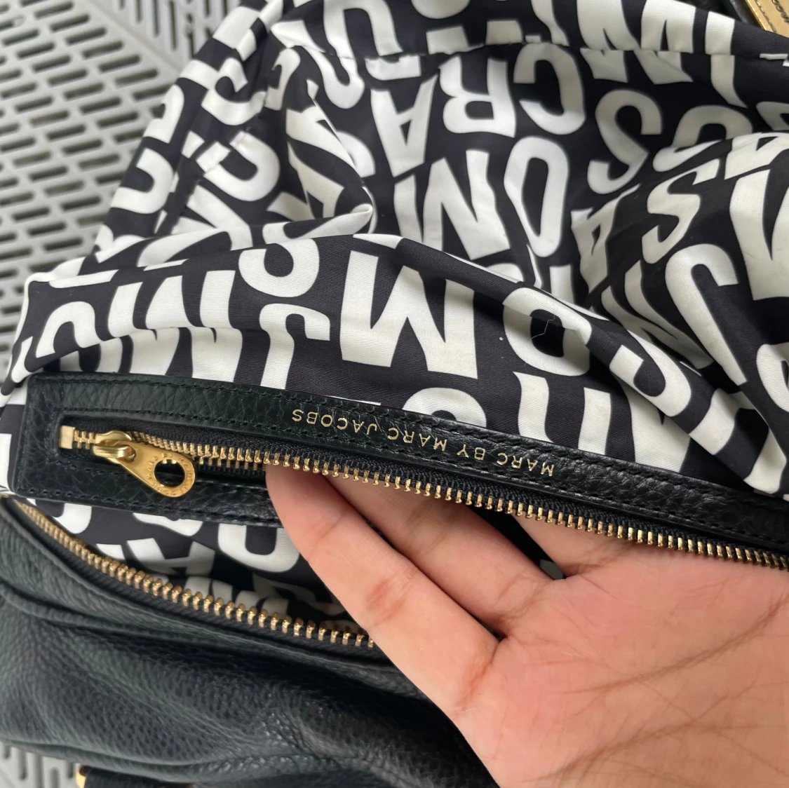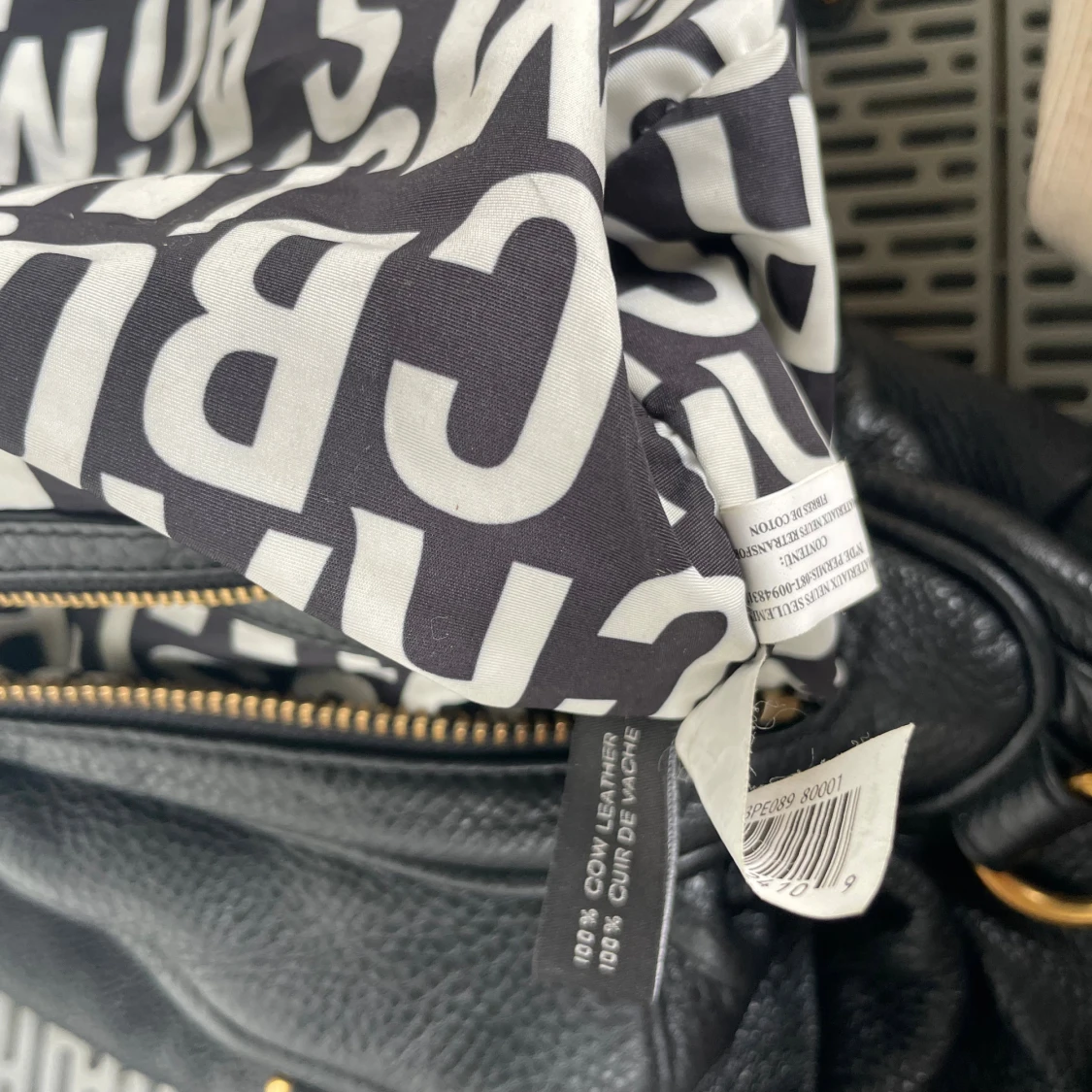 Snygg svart handväska från Marc by Marc Jacobs i äkta skinn med guldfärgade metalldetaljer och dragkedja. Väskan har dubbla handtag och en cool logga i metall framtill. Fodret är mönstrat med stora bokstäver i svart och vitt. My lowewst price 🙏❤️