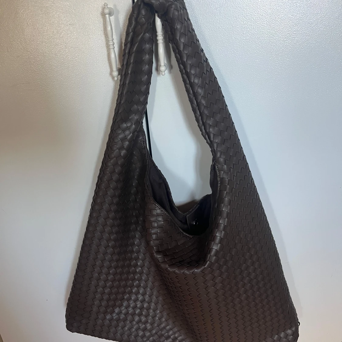 Säljer en stor brun axelväska med flätad design. Väskan har en bred axelrem och är tillverkad i skinnimitation. Perfekt för dig som gillar en stilren och trendig look med plats för allt du behöver. använd endas 1 gång