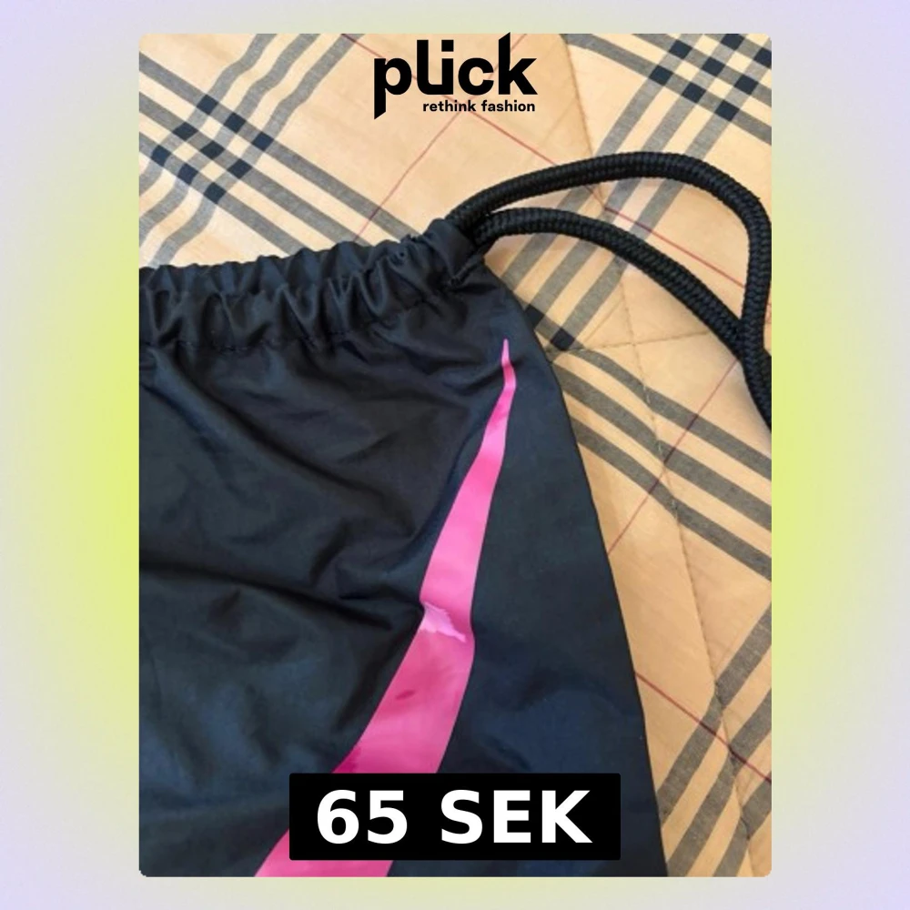 Säljer en svart gympåse från Nike med en stor rosa swoosh på framsidan. Väskan har praktiska snören för att enkelt kunna bäras på ryggen och är tillverkad i slitstark polyester. Perfekt för träning eller att ha med till skolan.