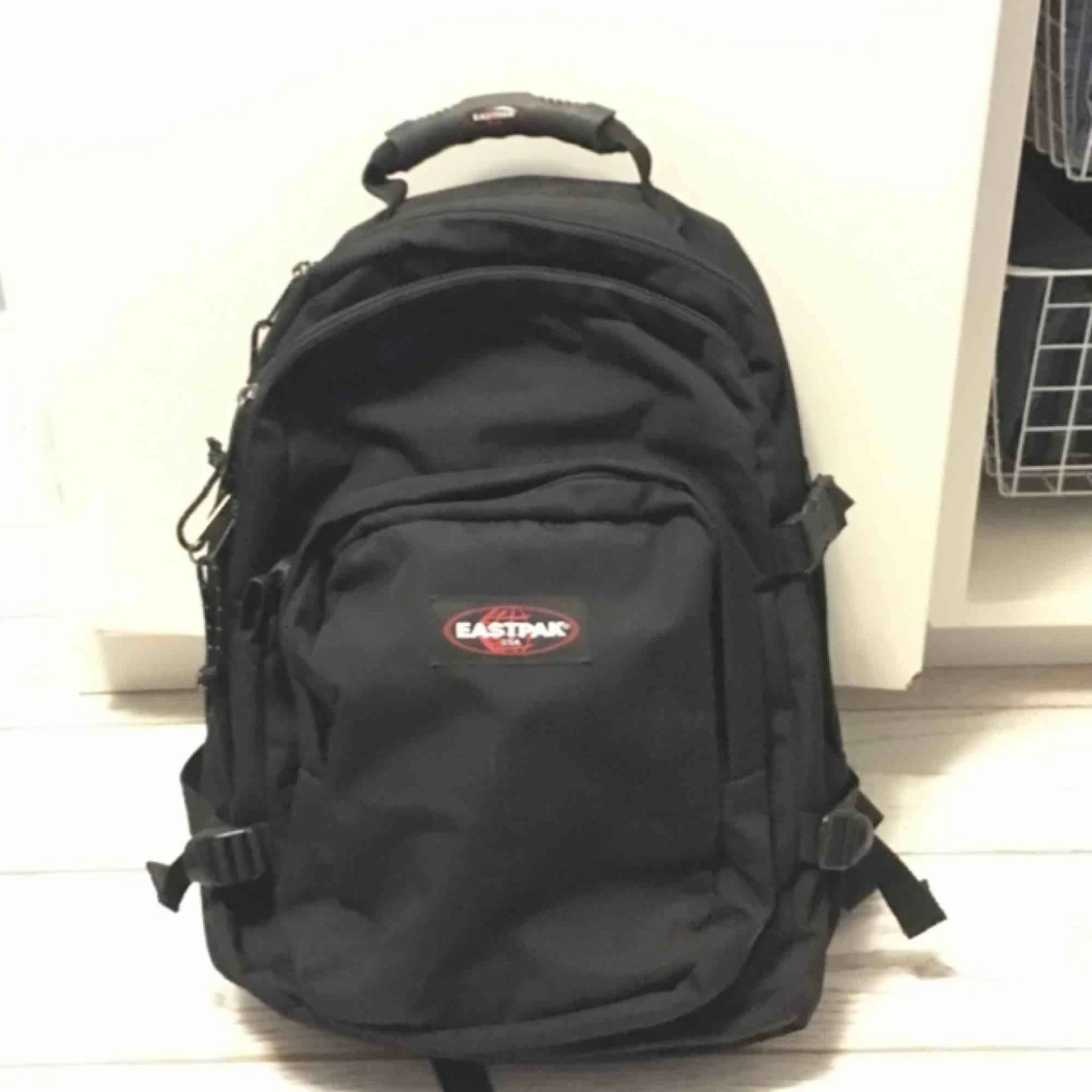 Svart Eastpak ryggsäck ”Provider” i superfint skick! Använd cirka 5 gånger. Många bra fack. Ett stort fack inkl vadderat laptopfack. Ett mellanfack och ett mindre med småfack i. Spännremmar på varje sida. Vadderad rygg och bärremmar. Nypris cirka 900:-
