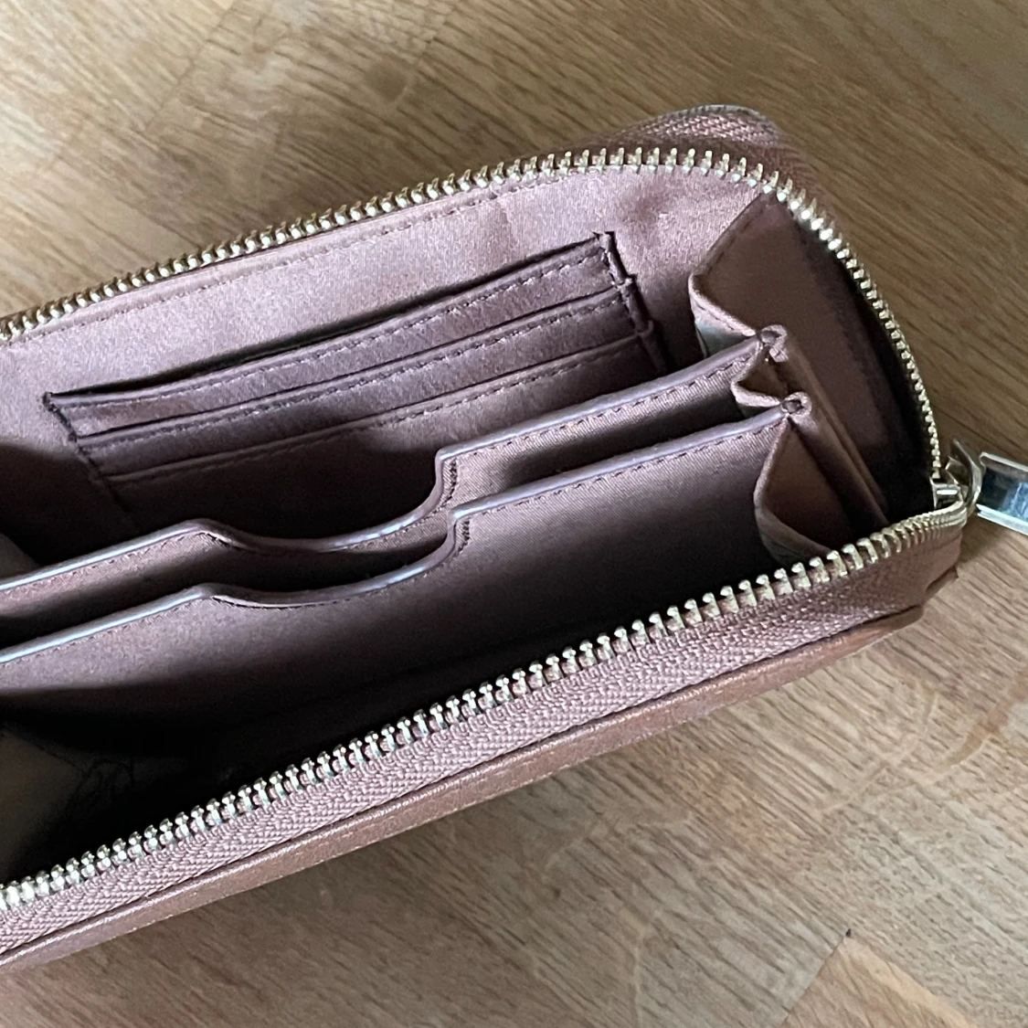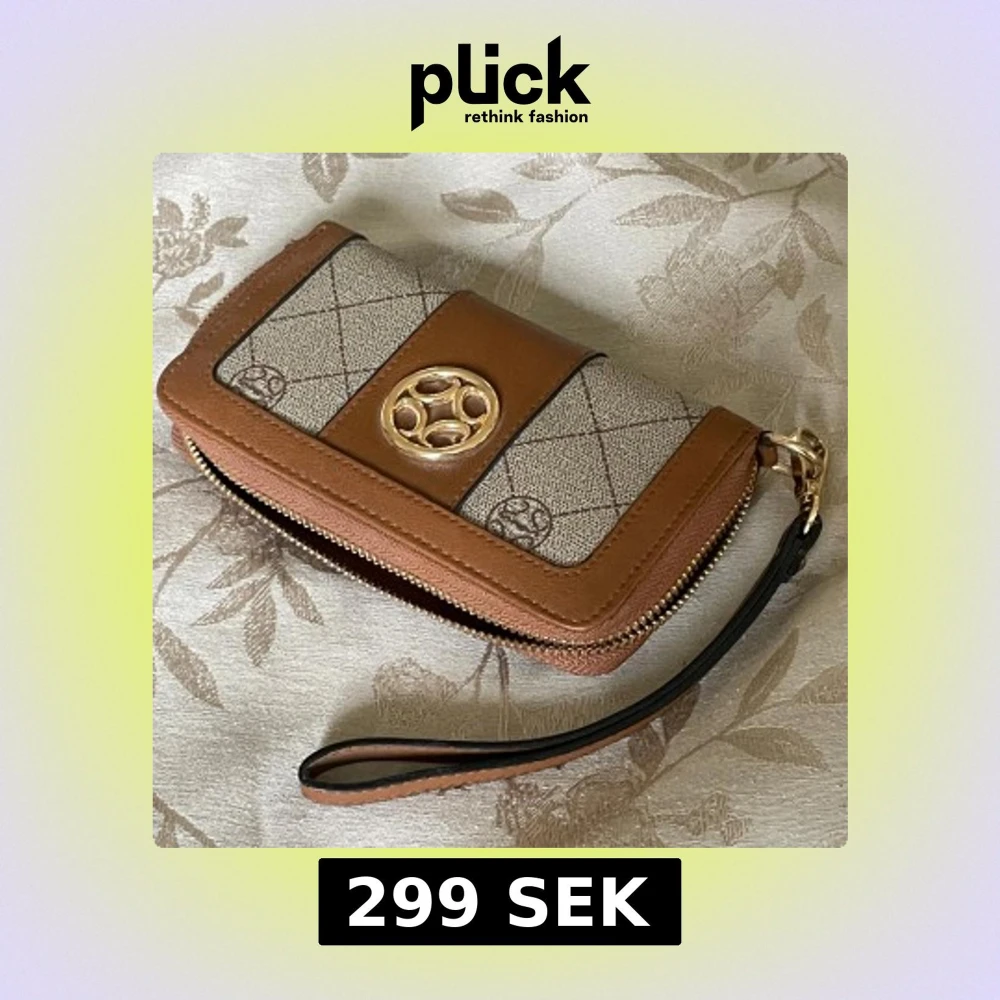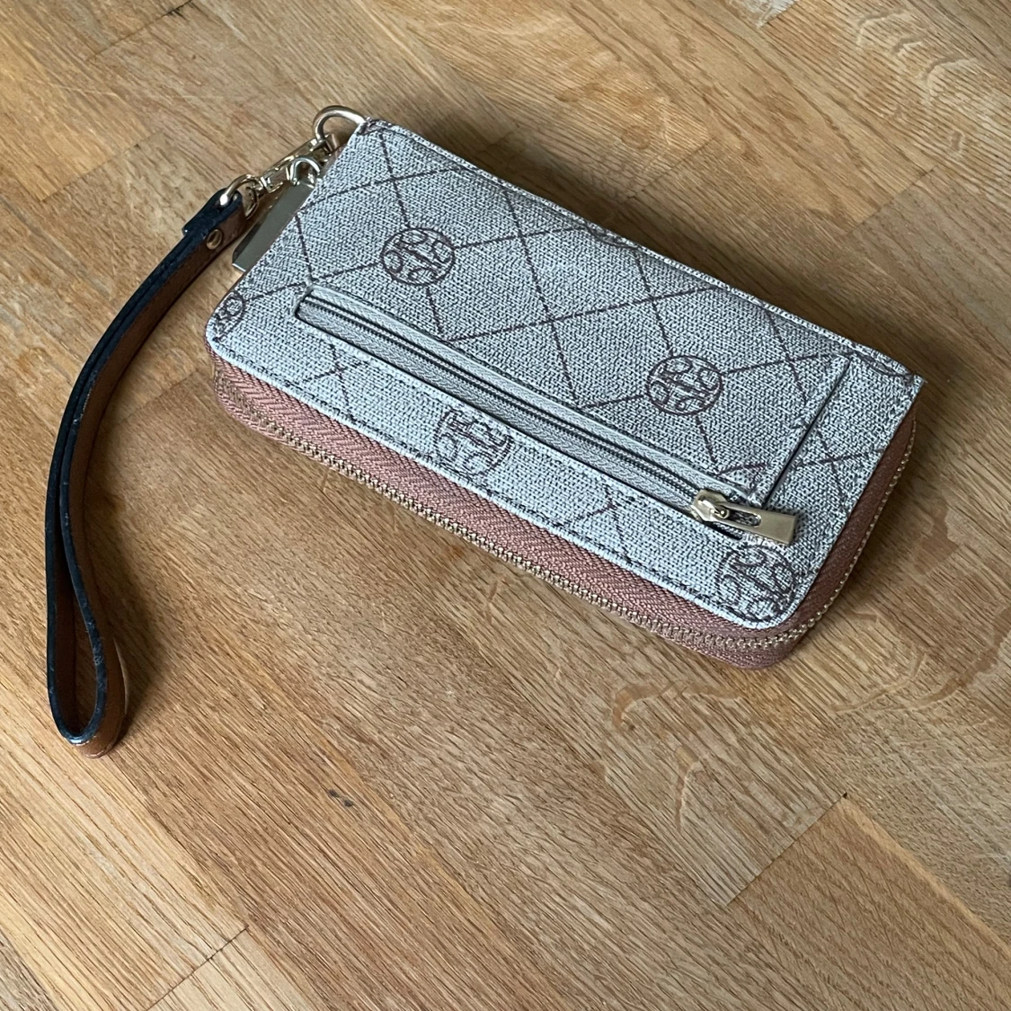 Snygg plånbok i beige och brunt med klassiskt mönster och guldfärgad logga framtill. Plånboken har dragkedja runtom, flera fack för kort och mynt samt en praktisk handledsrem. Perfekt storlek för att ha med sig överallt. Denna är köpt för länge sen, men använts en gång! 🤎