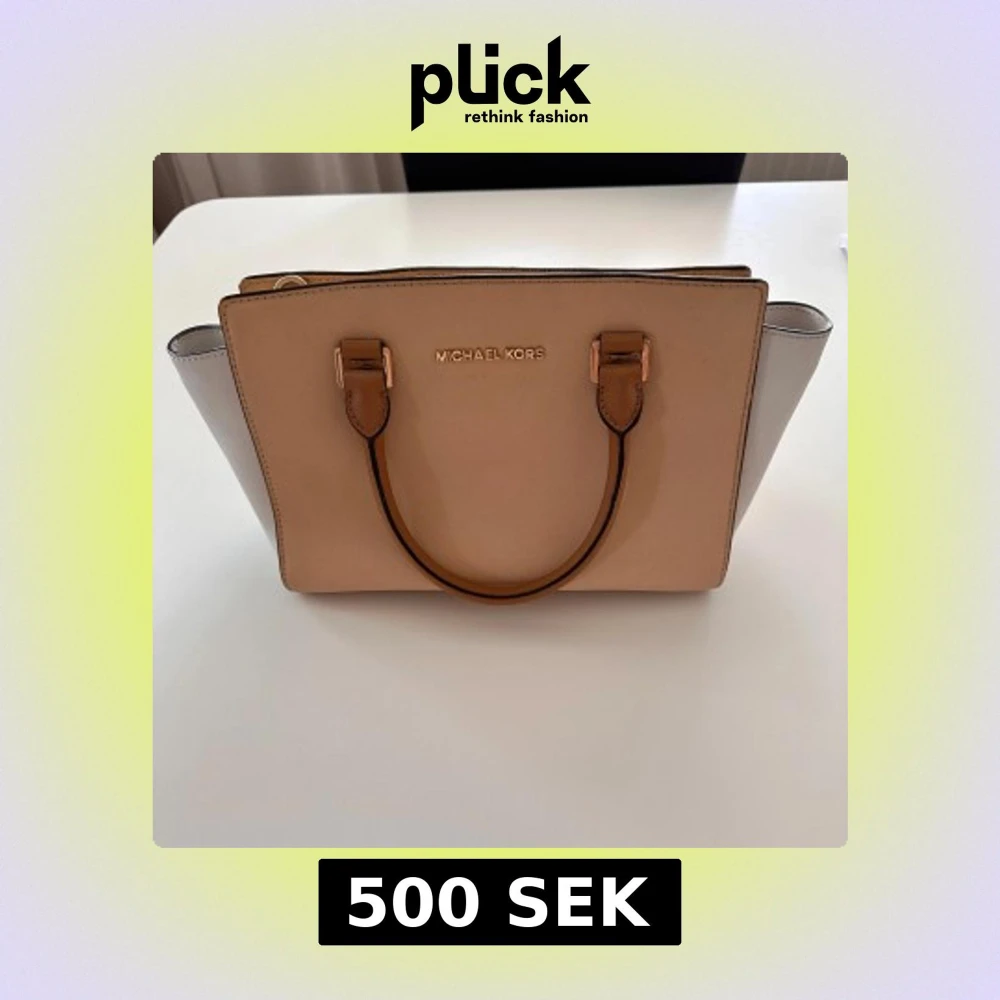 Säljer en stilren handväska från Michael Kors i beige och vitt. Välanvänd men har mycket kvar att ge. Lite missfärgning + fläckar som du ser på bild (inte testat att tvätta). Väskan har två handtag och en dragkedja upptill. Insidan är rymlig med flera fack för enkel organisering. Perfekt för att bära med sig det nödvändigaste med stil. Dyr i inköp!!