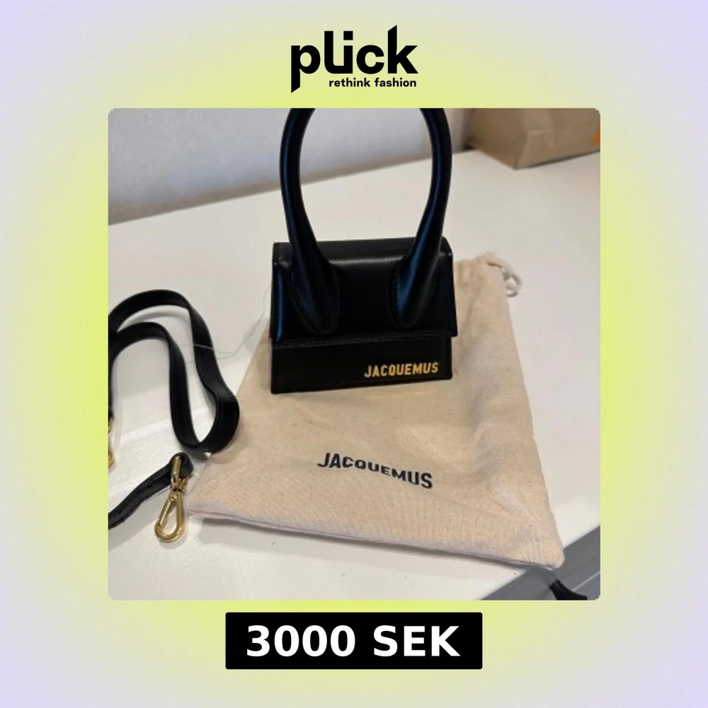 Superfin svart minihandväska från Jacquemus i slätt skinn med guldiga detaljer och logga framtill. Väskan har ett stilrent, fyrkantigt format, ett kort handtag och en avtagbar axelrem med guldfärgade spännen. 12 x 9 cm. Använd 1 gång, orginal påse certifikat följer med, seriösa köpare kan få se online kvitto!