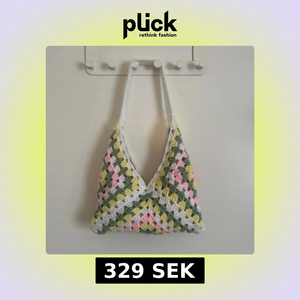 Egen virkad väska i med grönt, rosa, gul och vitt. Den har en triangulär form och en enkel axelrem. Perfekt för våren och sommaren med dessa pastellfärger🌸