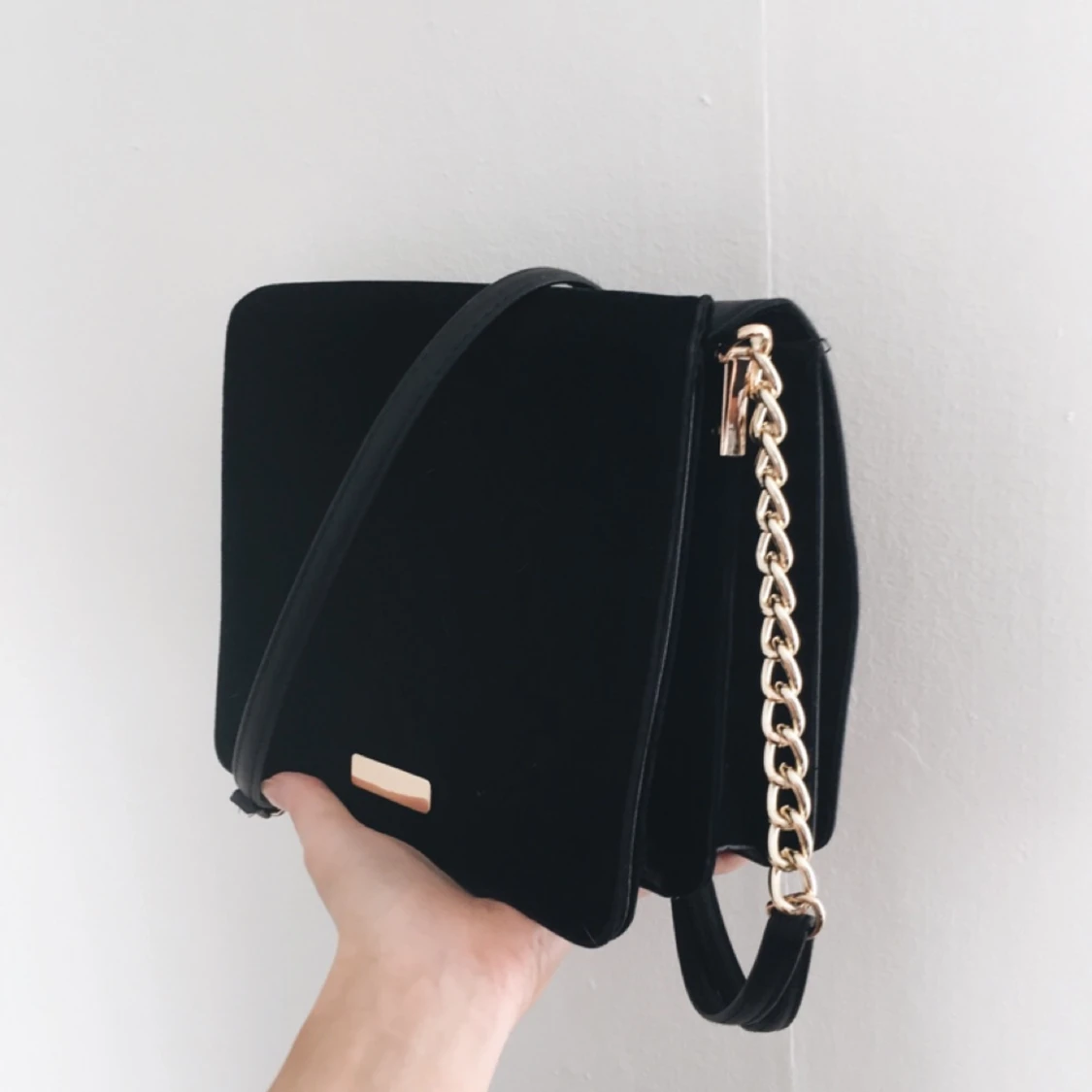Söt liten väska med gulddetaljer, skinnimitation på ena sidan och sammet på andra. Kan användas både som clutch eller över axeln. Köpt i London i september.