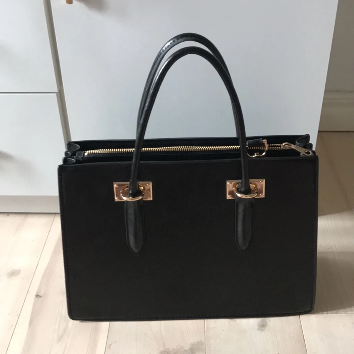 Väska från h&m (nyskick!) Helt oanvänd, svart med gulddetaljer Två handtag och lång axelrem som är avtagbar. Dragkedja i mitten och två öppna fack med innerfack för mobil/ småsaker Svart innerfoder 25cm hög och 33 cm bred