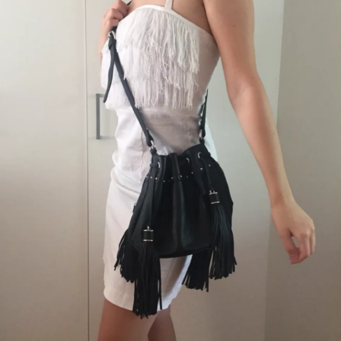 Superfin svart väska i läderimmitation! Lagom rymlig med snygga tasseldetaljer på utsidan. Frakt: 58kr